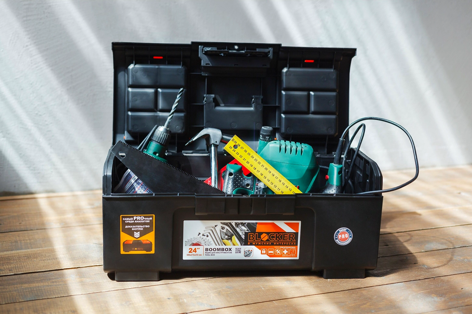 Ящик Boombox предназначен для хранения ручного и электроинструмента. Модель изготовлена из прочного пластика и оснащена удобной ручкой, которая обеспечивает надежный перенос. Конструкция замка разработана специально для легкого открытия одной рукой, но при этом исключено случайное открывание ящика. За счёт опор в основании, ящик устойчивый и имеет максимальный объем хранения. Дополнительный съемный лоток и внешние отделения на крышке позволяют хранить необходимые инструменты и мелочи, например, саморезы и дюбели.