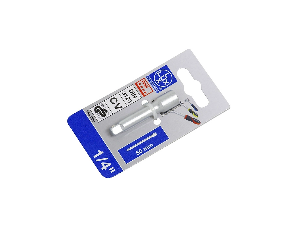 Удлинитель LUX-TOOLS 6,3 мм (1/4 дюйма) длиной 50 мм для сменных головок торцевых ключей с присоединительным квадратом, оснащен шариковым стопором.