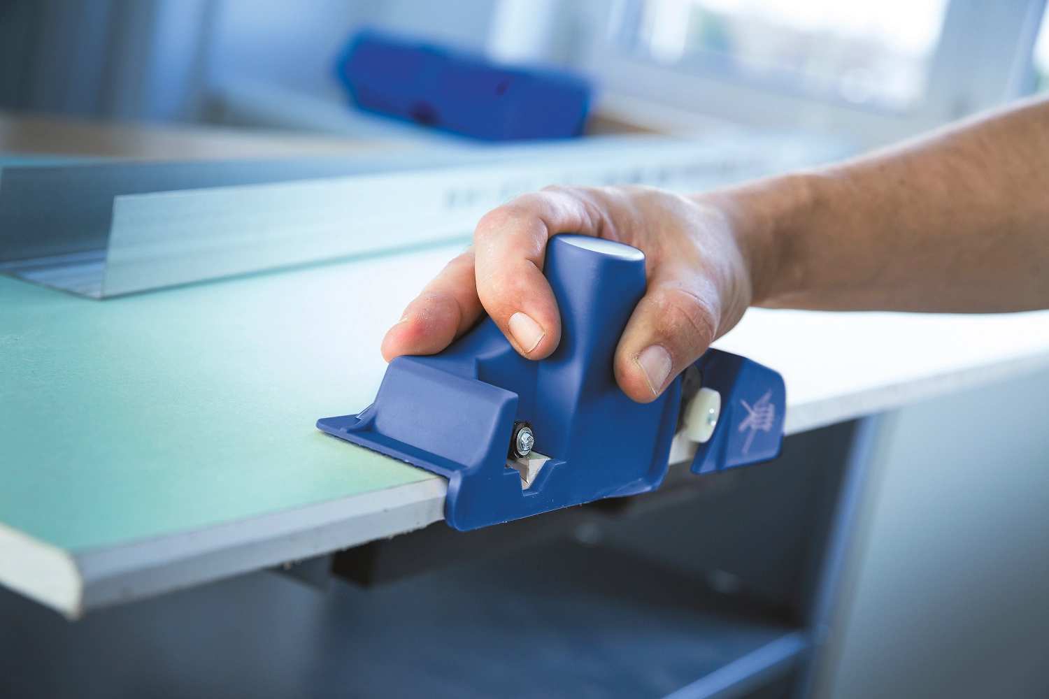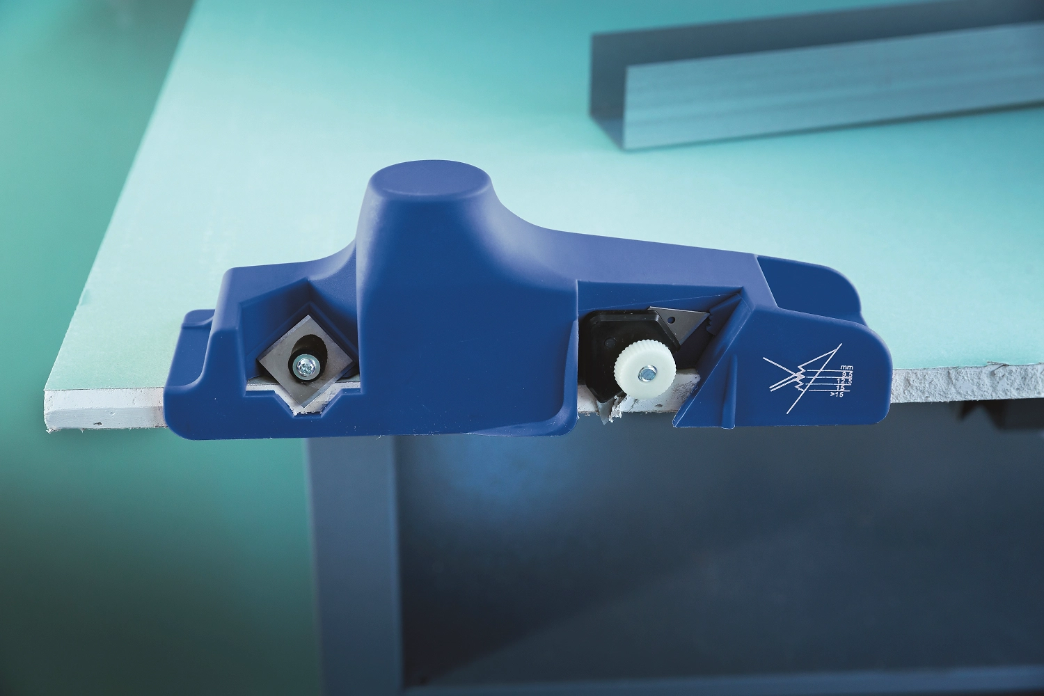 Кромкорез LUX-TOOLS - практичный инструмент для обработки кромок. Рубанок выполнен из армированного нейлона синего цвета. Материал прочный и очень легкий. Используя два острых лезвия, которые прочно прикручены к плоскости, можно быстро и точно обрезать края гипсокартона. Передний нож можно отрегулировать под разную толщину панели от 9,5 мм до 15 мм. Задний нож надежно фиксируется под углом 45 ° и в то же время срезает небольшой скос для размещения заполнителя шва в гипсокартоне. Вы можете заменить оба лезвия, если они затупились.
