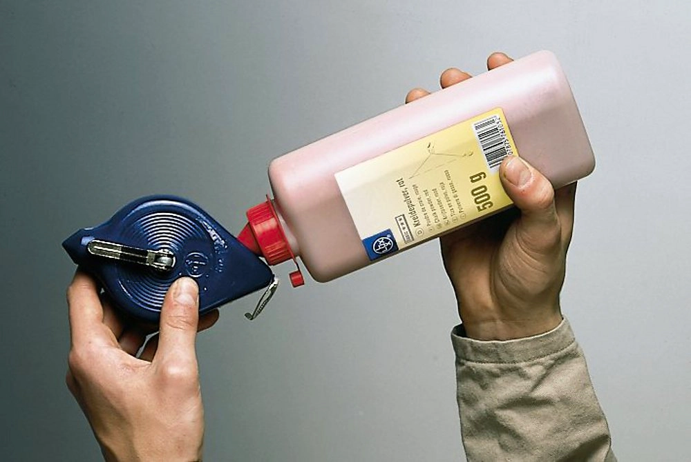 Порошок засыпается в корпус разметочного устройства со шнуром. Для экономичного расходования и удобной засыпки порошка, пластиковая ёмкость имеет специальный "носик" - дозатор, который вставляется в загрузочное отверстие корпуса разметочного устройства. После использования носик дозатора закрывается пробкой.