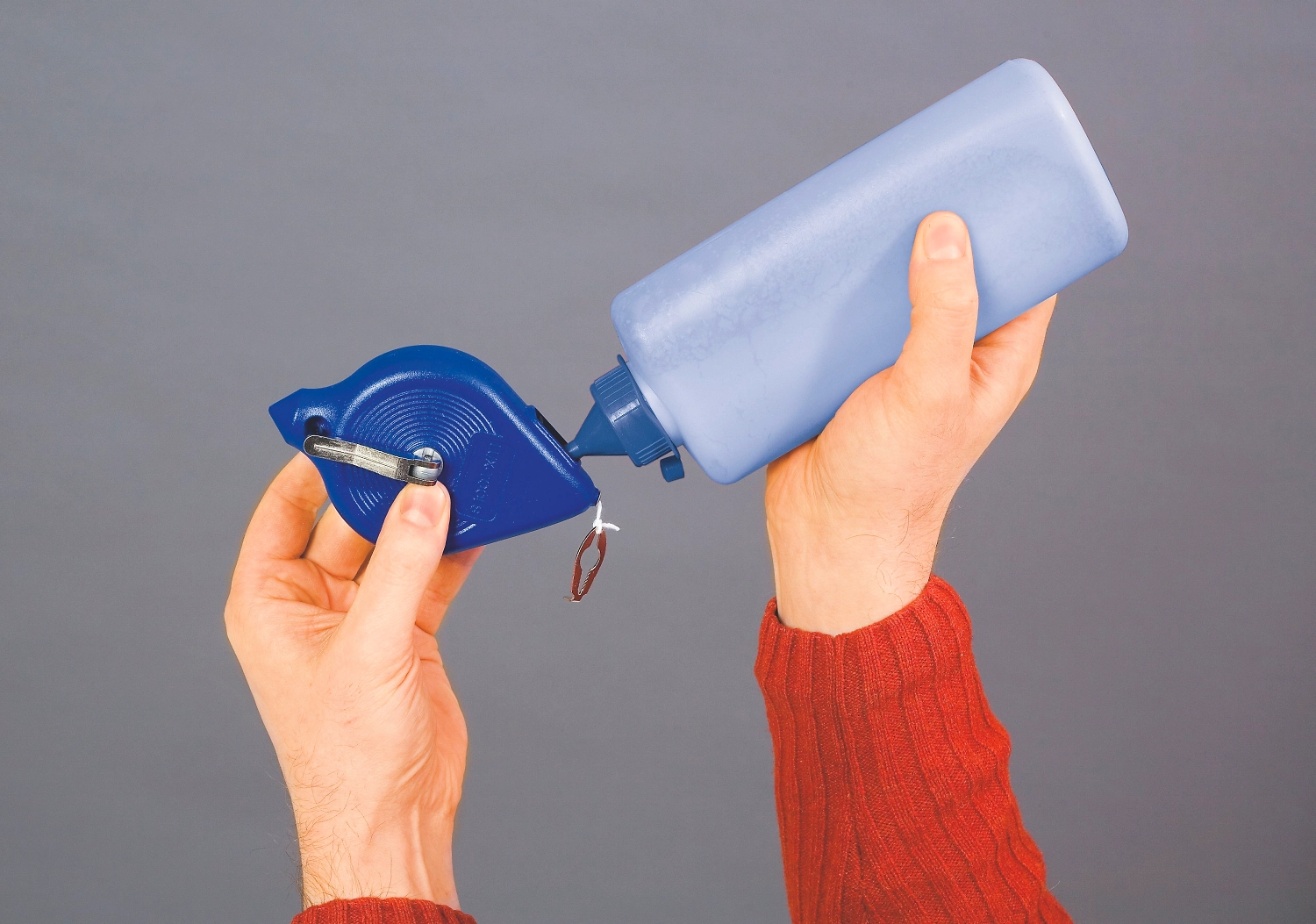 Порошок засыпают в специальное отверстие разметочного устройства и плотно закрывают пробкой. Если разметочное устройство используют впервые, следует отмотать отбивочный шнур как минимум наполовину, заполнить 1/3 контейнера порошком и снова свернуть шнур. Оставшуюся часть состава досыпать, когда свободный край шнура составит около метра.