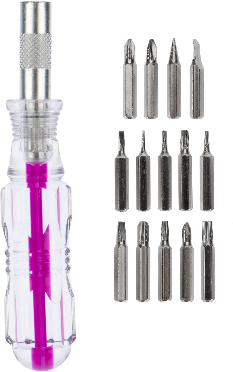 Набор отверток для точных работ арт. 12-4704 REXANT 16 предметов предназначен для выполнения прецизионных работ в электронике и электромеханике. Эргономичная прозрачная двухкомпонентная рукоятка отвертки делает работу с инструментом легкой и удобной. Биты набора выполнены из хромованадиевой стали. Магнитный держатель обеспечивает быструю замену и надежную фиксацию насадок. Набор поставляется в пластиковом боксе и содержит 16 предметов: Отвертка 1 шт. Биты 15 шт. (PH00, PH0, PH1, PH2, T5, T6, T7, T8, T9, T10, T15, U4, ⊙, SL2, SL3)