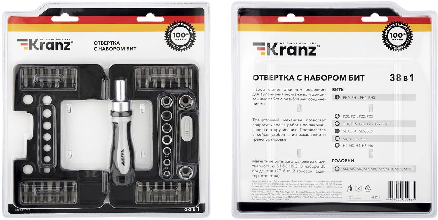 Набор отверток KRANZ, 38 предметов в кейсе, предназначен для выполнения монтажных и демонтажных работ с резьбовыми соединениями. Биты набора выполнены из хромованадиевой стали. Магнитный держатель обеспечивает быструю замену и надежную фиксацию насадок. Отвертка оснащена реверсивным механизмом (реверс по часовой стрелке, реверс против часовой стрелки, фиксация). Твердость бит: 51-56 HRC Набор поставляется в кейсе, удобен в использовании и транспортировке, содержит 38 предметов: Шестигранная звезда: T10, T15, T20, T25, T27, T30 Шестигранник: H2, H3, H4, H5, H6 Крестовая: PZ0, PZ1, PZ2, PZ3 Крестовая: PH0, PH1, PH2, PH3 Шлицевая: SL3, SL4, SL5, SL6 S: S0, S1, S2, S3 Адаптер Головки: M4, M5, M6, M7, M8, M9, M10, M11, M12