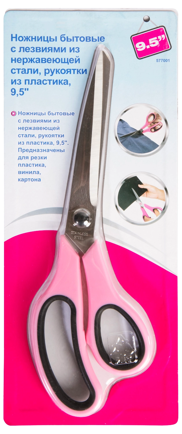 Ножницы бытовые с лезвиями из нержавеющей стали, рукоятки из пластика. Предназначены для резки пластика, винила, картона.