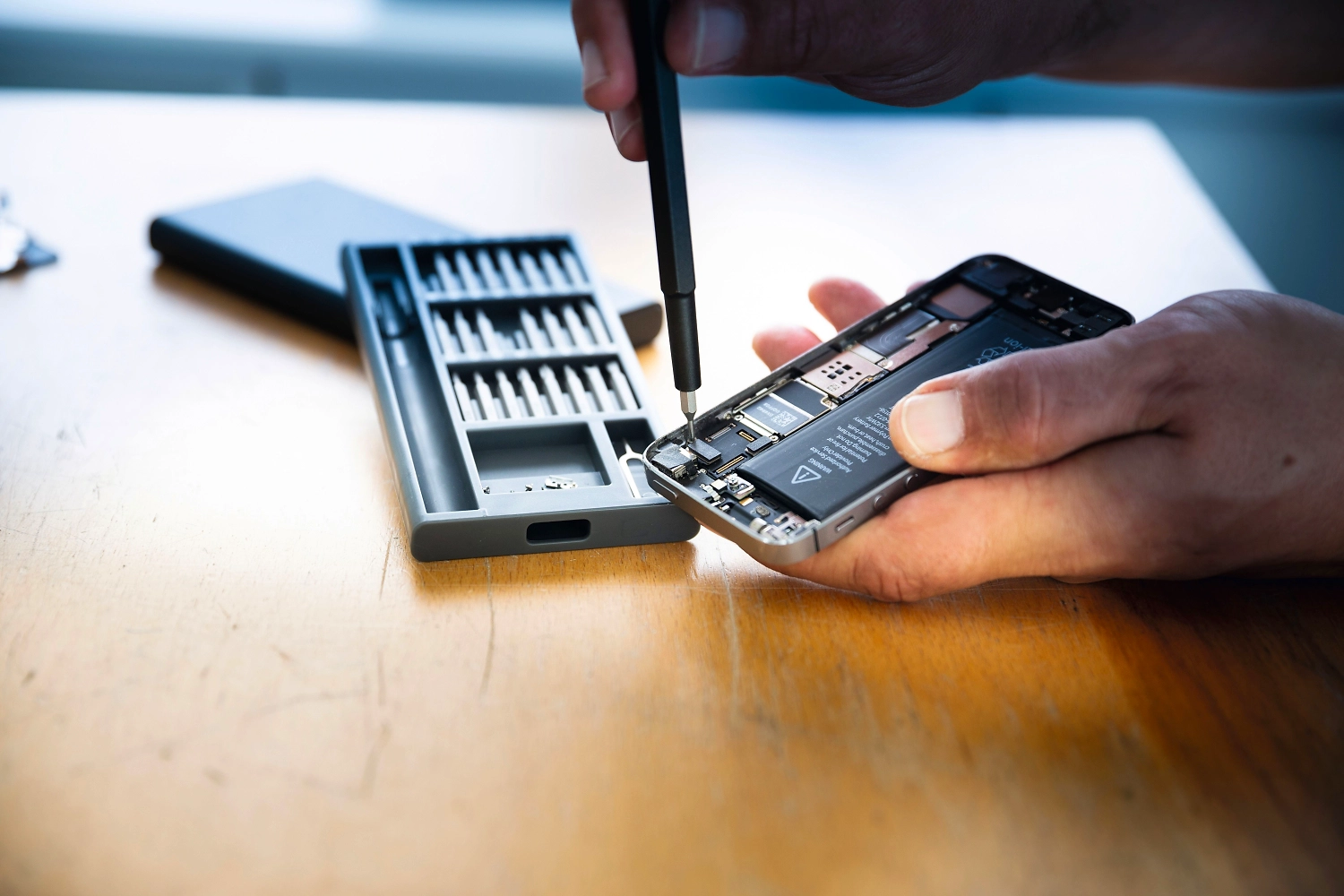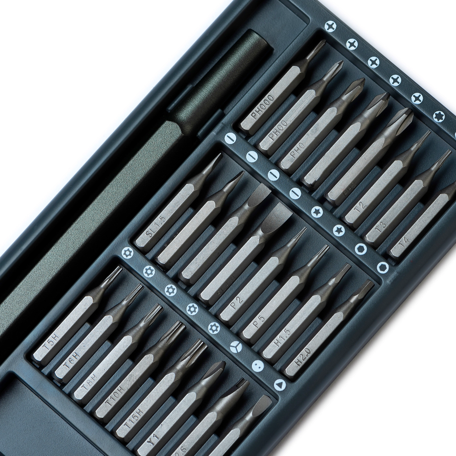 Набор для для ремонта телефонов в металлическом пенале, в набор входит: алюминиевая ручка отвертки 1 шт, 24 сменные биты стальные (S2), скрепка для извлечения sim-карты из алюминия - 1 шт.