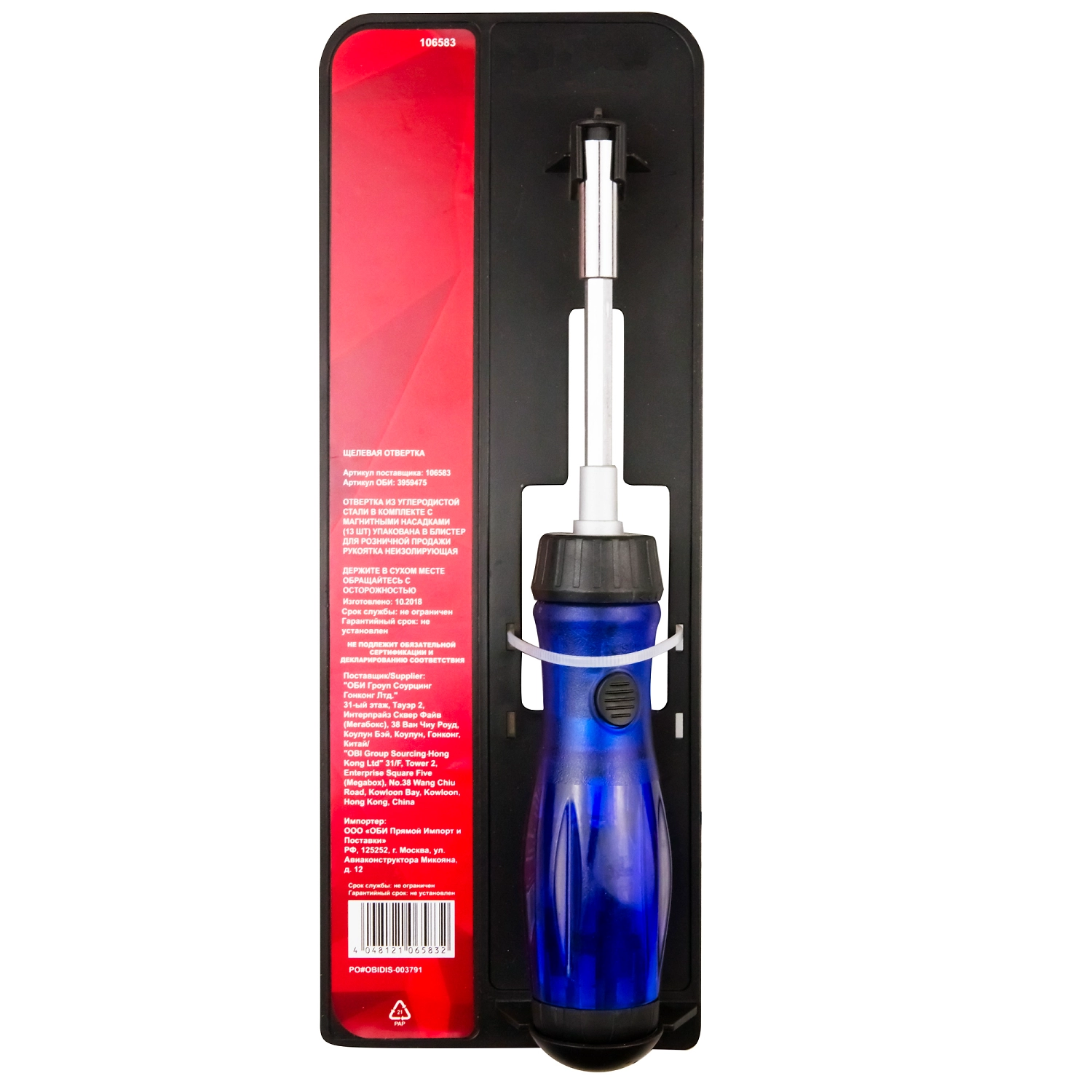 Отвертка из углеродистой стали в комплекте с магнитными насадками (13 шт) упакована в блистер для розничной продажи, рукоятка неизолирующая.