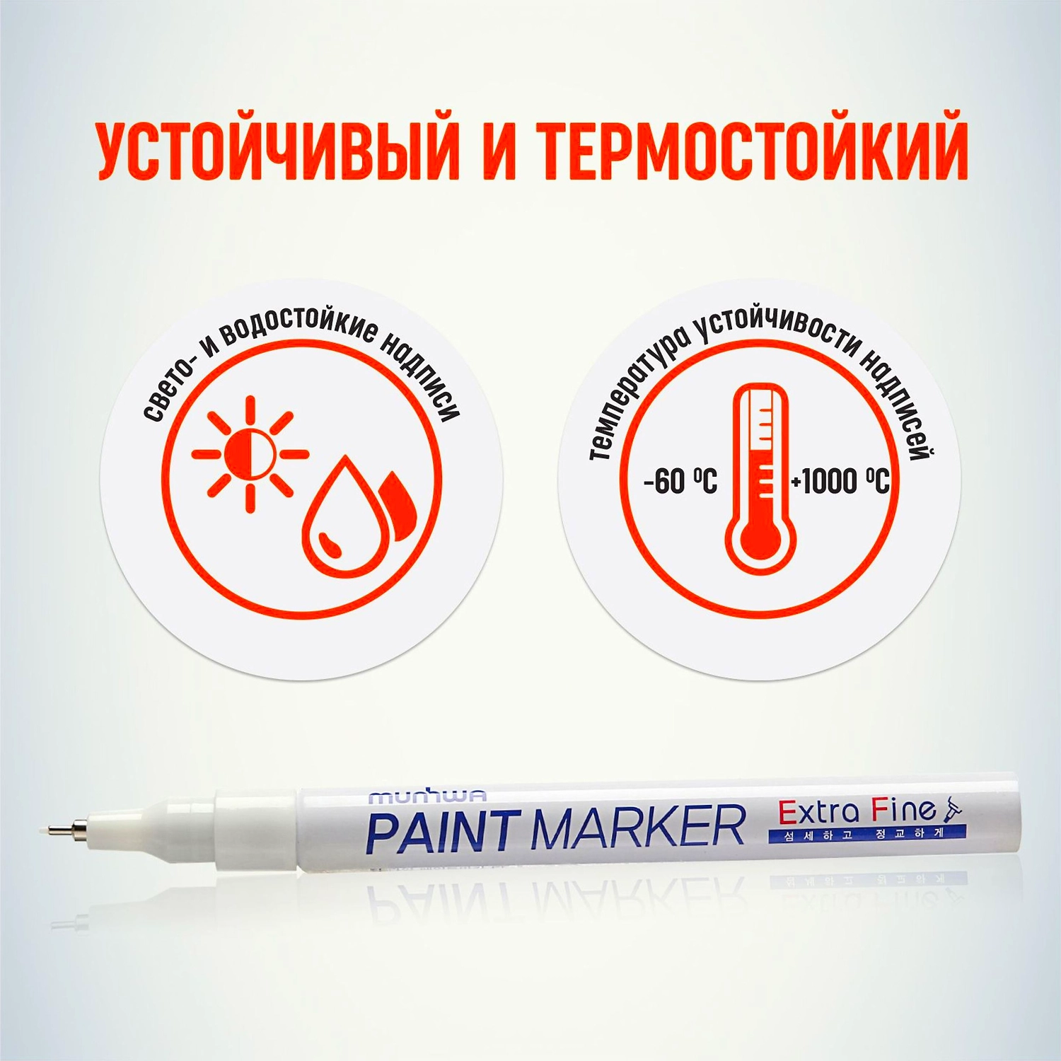 Маркер-краска (лаковый маркер) MunHwa "Extra Fine Paint Marker" - профессиональный лаковый маркер на нитрооснове. Цвет чернил - белый, диаметр пишущего узла - 1 мм. Маркер-краска MunHwa Extra Fine предназначен для нанесения деликатной маркировки на гладкие поверхности (металл, пластмасса, резина, кожа и пр.). Отлично подходит для маркировки фото пленок и рентгеновских снимков, имеет широкое применения в дизайне, декорировании и оформлении. Корпус маркера изготовлен из прочного алюминия. Клапанный механизм пишущего узла исключает растекание и разбрызгивание краски, преждевременное пересыхание маркера, срок годности 5 лет. Благодаря высококачественным чернилам, краска ложиться на поверхность равномерным и однородным слоем, полностью закрашивая обрабатываемую поверхность, быстро сохнет. После высыхания, надписи обладают свето и водостойкостью, термостойкостью, устойчивостью к механическим воздействиям.