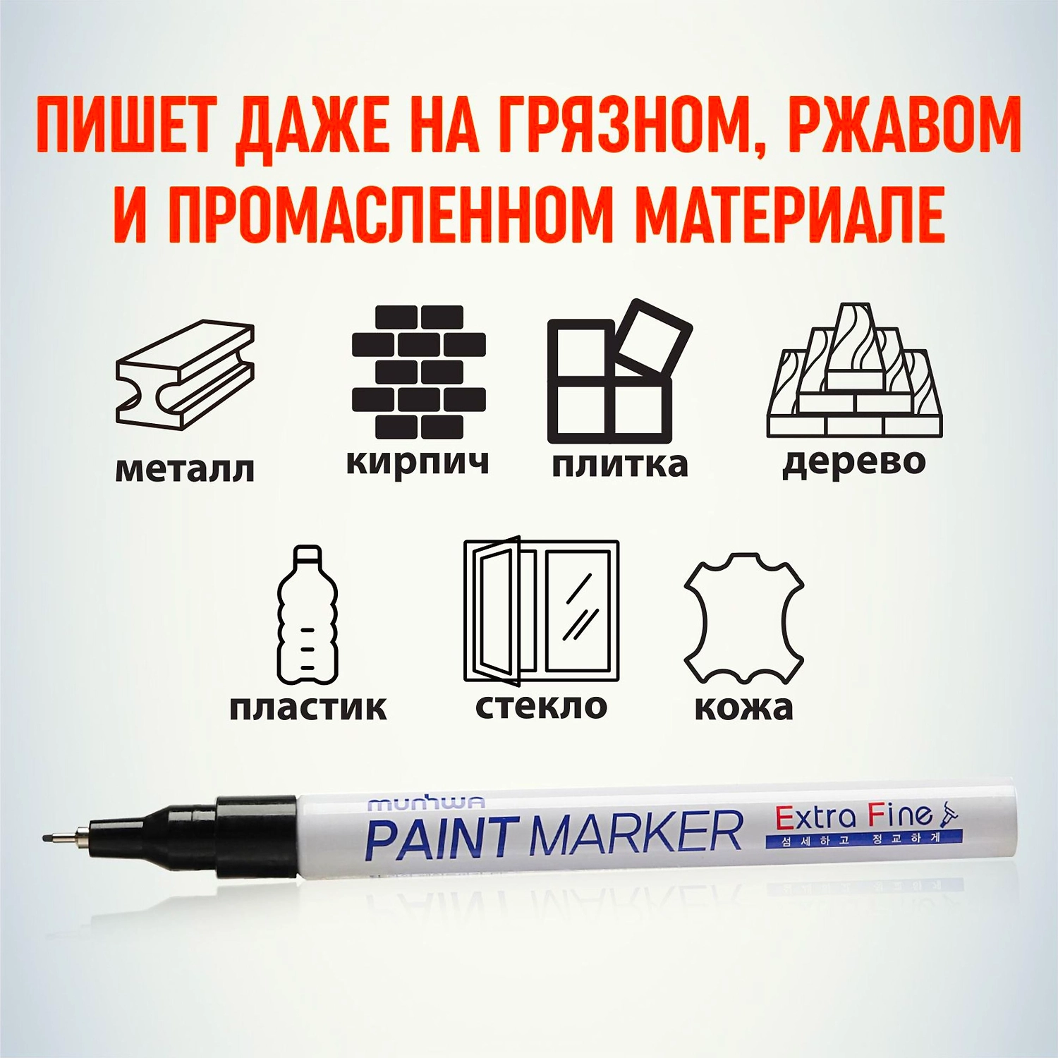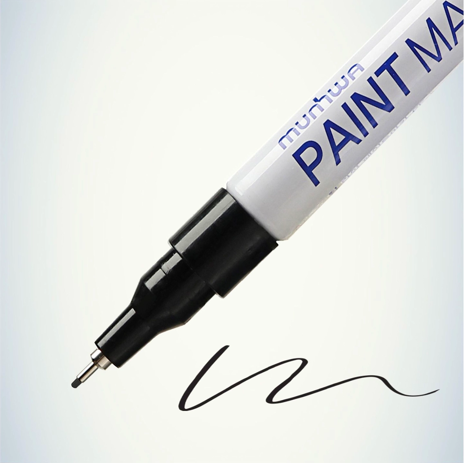 Маркер-краска (лаковый маркер) MunHwa "Extra Fine Paint Marker" - профессиональный лаковый маркер на нитрооснове. Цвет чернил - черный, диаметр пишущего узла - 1 мм. Маркер-краска MunHwa Extra Fine предназначен для нанесения деликатной маркировки на гладкие поверхности (металл, пластмасса, резина, кожа и пр.). Отлично подходит для маркировки фото пленок и рентгеновских снимков, имеет широкое применения в дизайне, декорировании и оформлении. Корпус маркера изготовлен из прочного алюминия. Клапанный механизм пишущего узла исключает растекание и разбрызгивание краски, преждевременное пересыхание маркера, срок годности 5 лет. Благодаря высококачественным чернилам, краска ложиться на поверхность равномерным и однородным слоем, полностью закрашивая обрабатываемую поверхность, быстро сохнет. После высыхания, надписи обладают свето и водостойкостью, термостойкостью, устойчивостью к механическим воздействиям.
