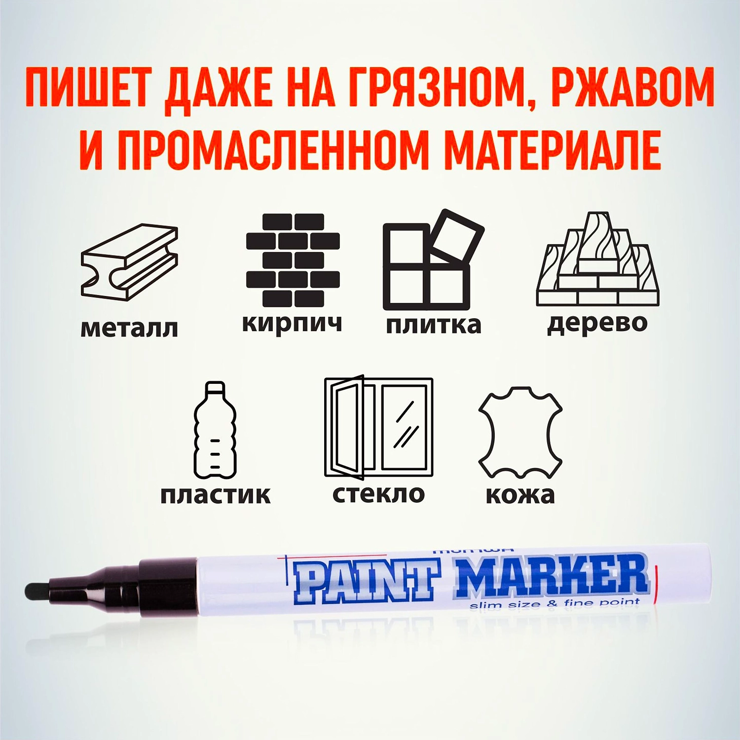 Маркер-краска (лаковый маркер) MunHwa - профессиональный лаковый маркер на нитрооснове. Маркер-краска MunHwa пишет на всех типах поверхностей: металл, дерево, резина, бетон, стекло, кожа. Цвет чернил - черный, диаметр пишущего узла - 2 мм. Paint Marker подходит для реставрации дефектов на бытовой технике, обуви, кузове автомобиля, а также надписей на каменных плитах. Маркер-краска MunHwa имеет широкое применения в дизайне, декорировании и оформлении. Корпус маркера изготовлен из прочного алюминия. Клапанный механизм пишущего узла исключает растекание и разбрызгивание краски, преждевременное пересыхание маркера, срок годности 5 лет. Благодаря высококачественным чернилам, краска ложиться на поверхность равномерным и однородным слоем, полностью закрашивая обрабатываемую поверхность, быстро сохнет. После высыхания, надписи обладают свето и водостойкостью, термостойкостью, устойчивостью к механическим воздействиям.