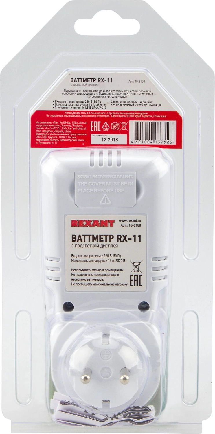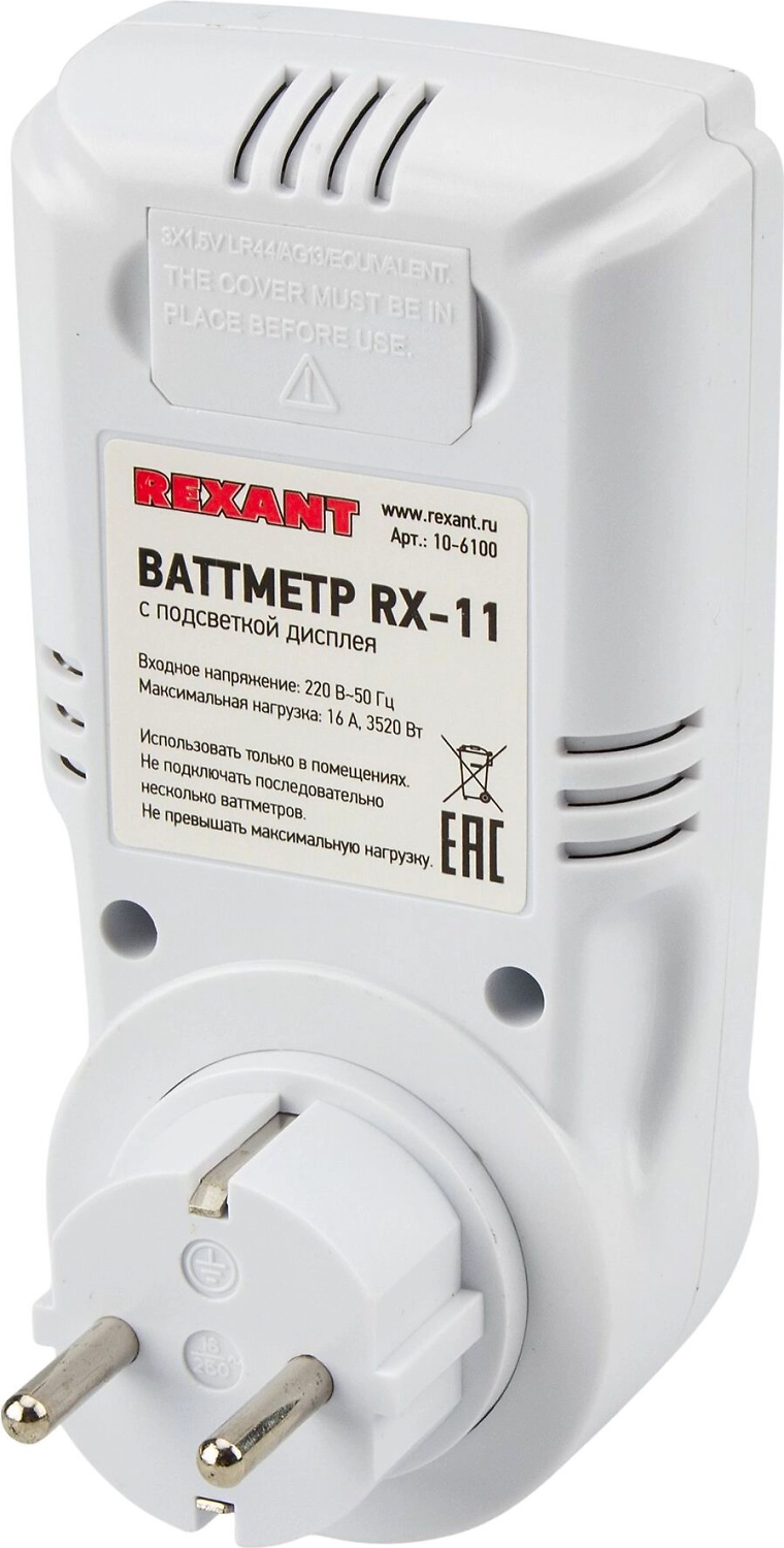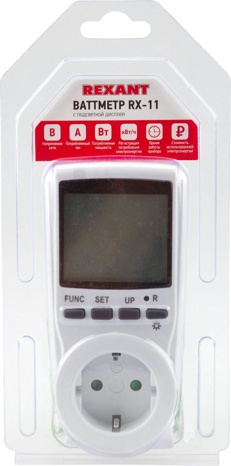 Простой в использовании счётчик потребляемой электроэнергии розетка-ваттметр/вольтметр/амперметр (измеритель мощности, напряжения, счётчик электроэнергии) REXANT RX-11 предназначен для измерения и контроля потребления энергии различными электроприборами, оснащен возможностью установки цены киловатт-часа, что позволяет узнать суммарную стоимость потребленной электроэнергии.