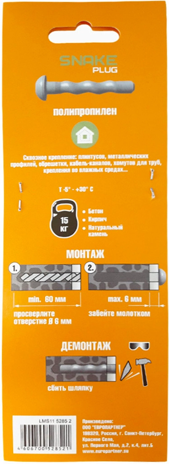 Дюбель SNAKE заменяет собой обычный дюбель-гвоздь с металлическим гвоздем. Предназначен для быстрого сквозного крепления металлических профилей, кабель-каналов, плинтусов, хомутов для труб, в полнотелые материалы(бетон, кирпич, камень). Использование дюбеля позволяет избежать ошибок монтажа обычным дюбель-гвоздем, он не подвержен коррозии, сокращает время на общий монтаж. Для наружных и внутренних работ.