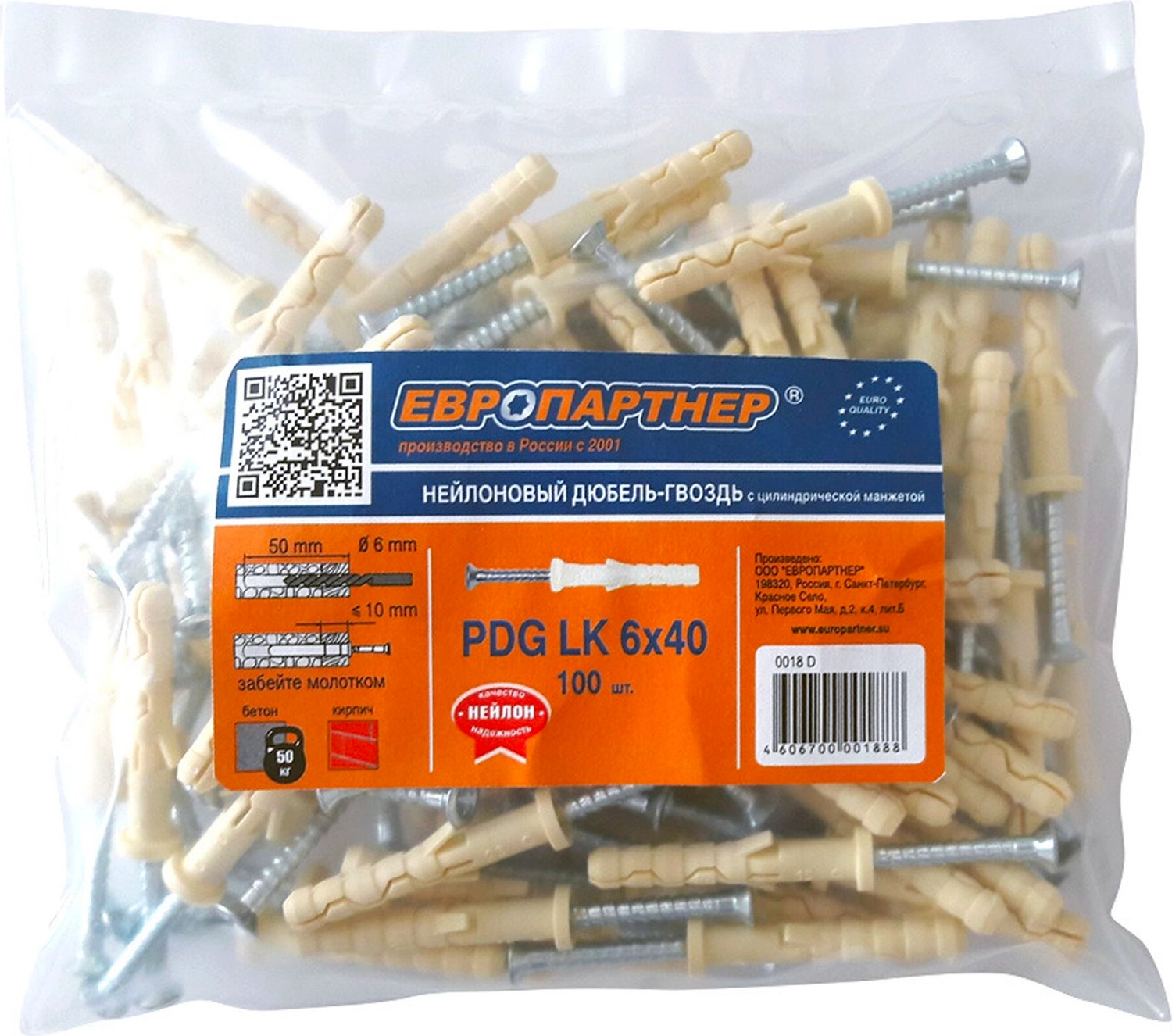 Дюбель-гвоздь ЕВРОПАРТНЕР PDG предназначен для легких креплений в твердых основаниях (бетон, кирпич или натуральный камень). Дюбель-гвоздь ЕВРОПАРТНЕР позволяет осуществлять быстрый, сквозной монтаж. Просто просверлите отверстие через прикрепляемый материал, забейте гвоздь молотком и крепление готово. Шлиц на шляпке служит исключительно целям демонтажа гвоздя выкручиванием.