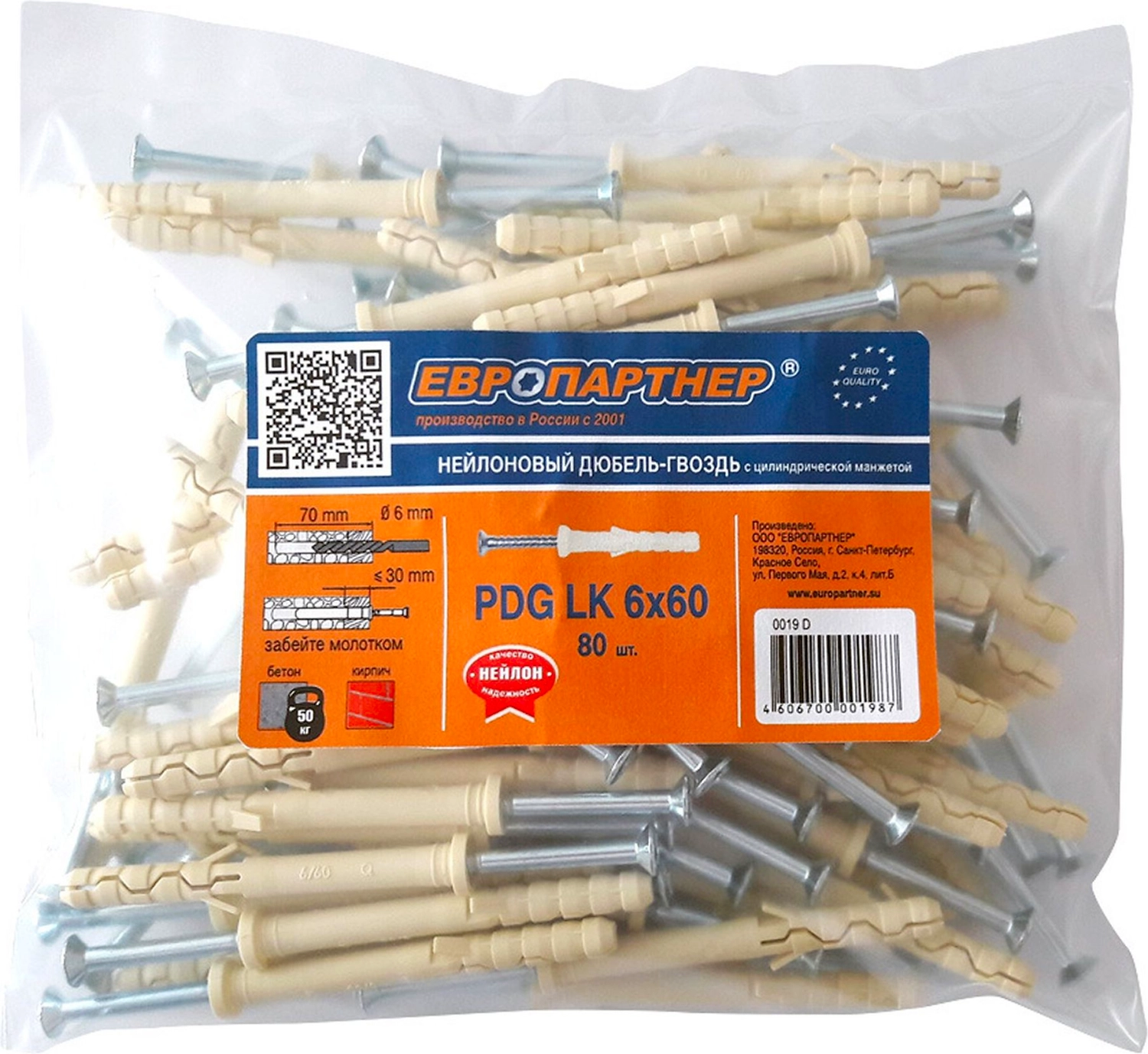 Дюбель-гвоздь с цилиндрической манжетой ЕВРОПАРТНЕР PDG LK 6x60 мм 80 шт