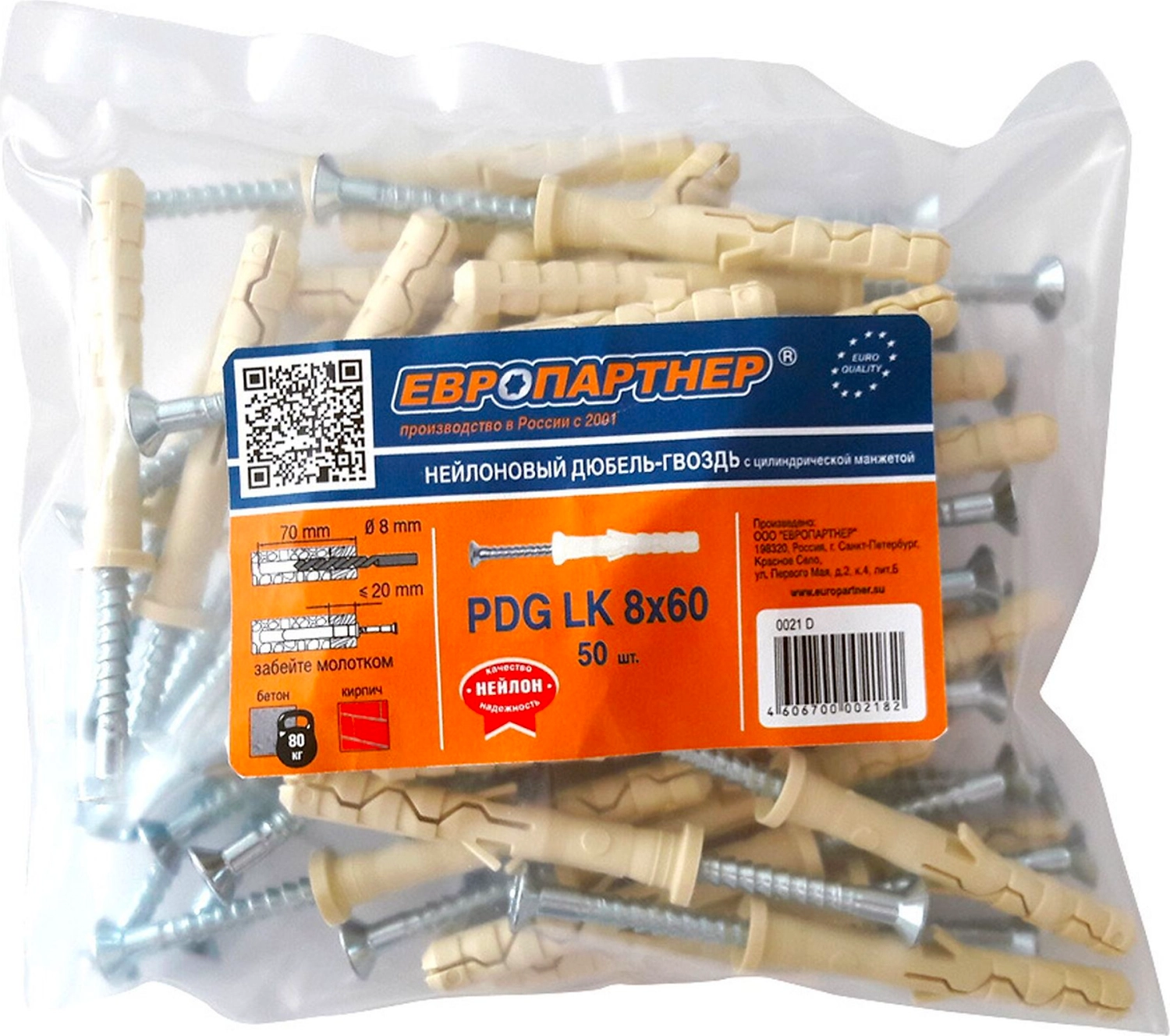 Дюбель-гвоздь ЕВРОПАРТНЕР PDG предназначен для легких креплений в твердых основаниях (бетон, кирпич или натуральный камень). Дюбель-гвоздь ЕВРОПАРТНЕР позволяет осуществлять быстрый, сквозной монтаж. Просто просверлите отверстие через прикрепляемый материал, забейте гвоздь молотком и крепление готово. Шлиц на шляпке служит исключительно целям демонтажа гвоздя выкручиванием.
