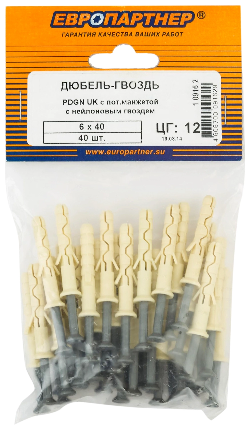 Дюбель-гвоздь универсальный ЕВРОПАРТНЕР PDGN LK, с цил. манжетой 6x40 (40 шт.)