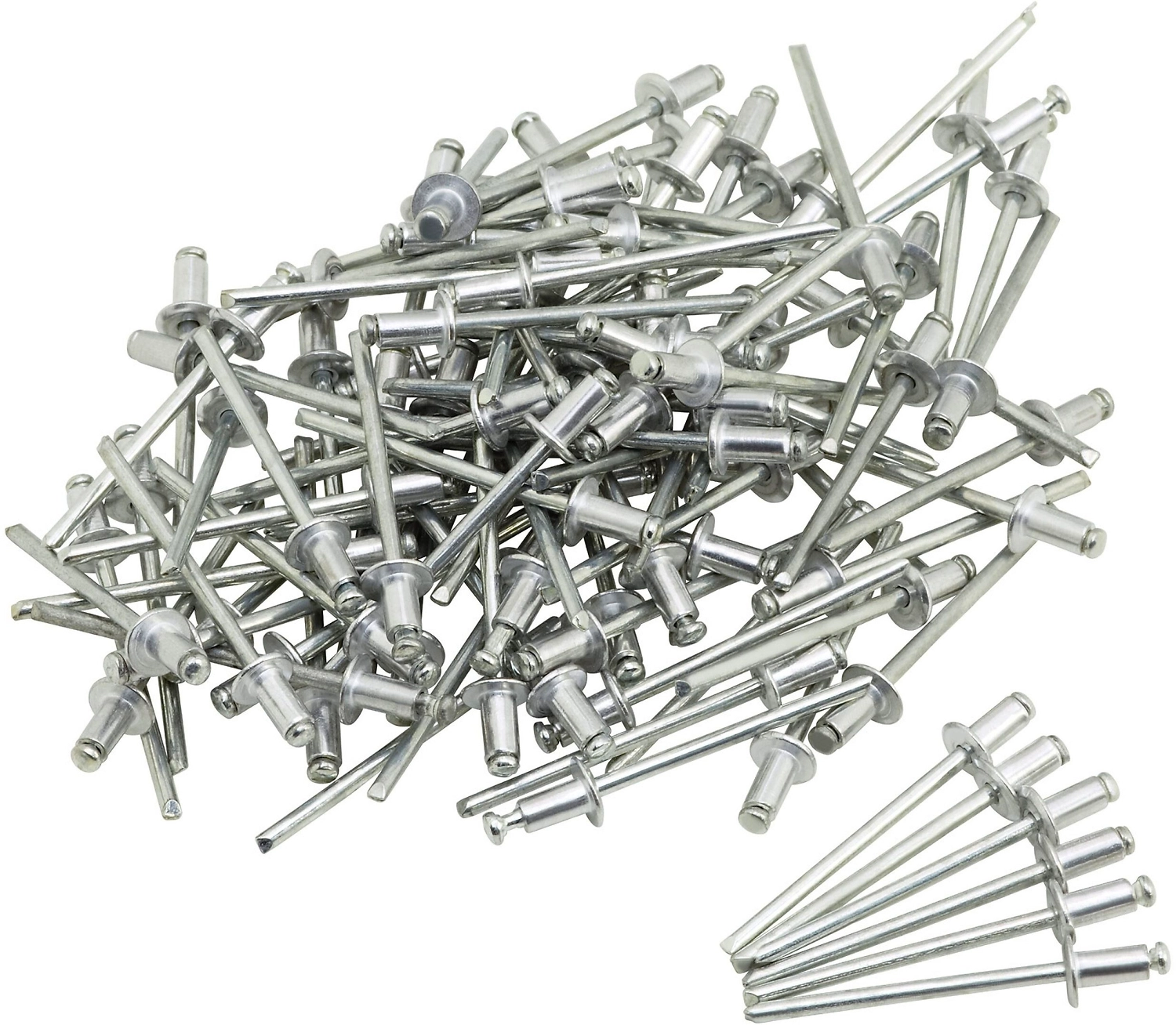 Набор глухих трубчатых заклепок. Гильзы изготовлены из алюминия, стержни - из стали. Соответствует стандарту DIN 7337. Размер: 3x8 мм. Диапазон зажима 4-5,5 мм. Количество - 100 шт.