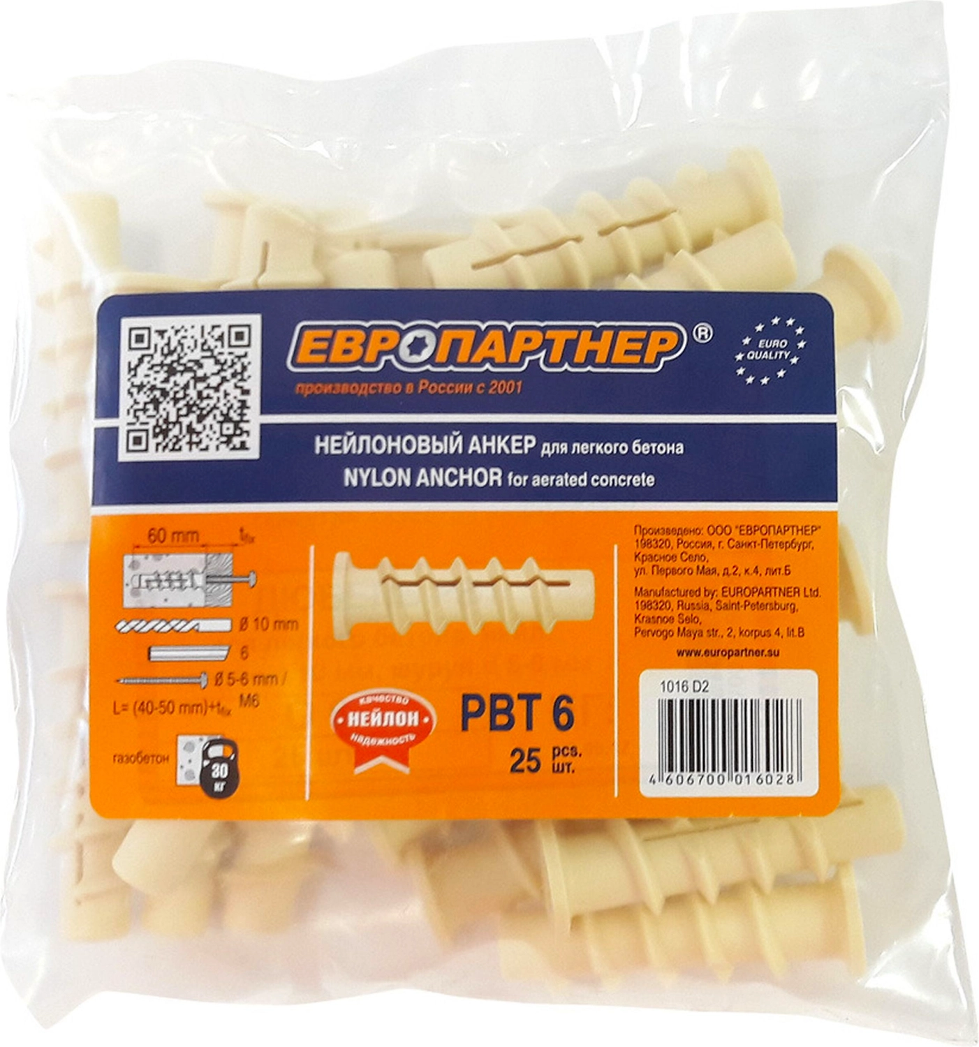 Дюбель для газобетона ЕВРОПАРТНЕР PBT-6 10x50 мм 25 шт