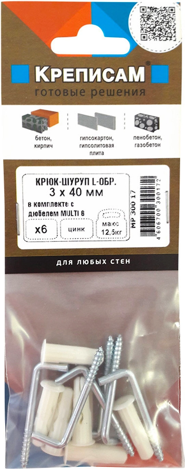 Дюбель ЕВРОПАРТНЕР MULTI Plug 6x25 мм с крюк-шурупом 3,9x40 мм 6 шт