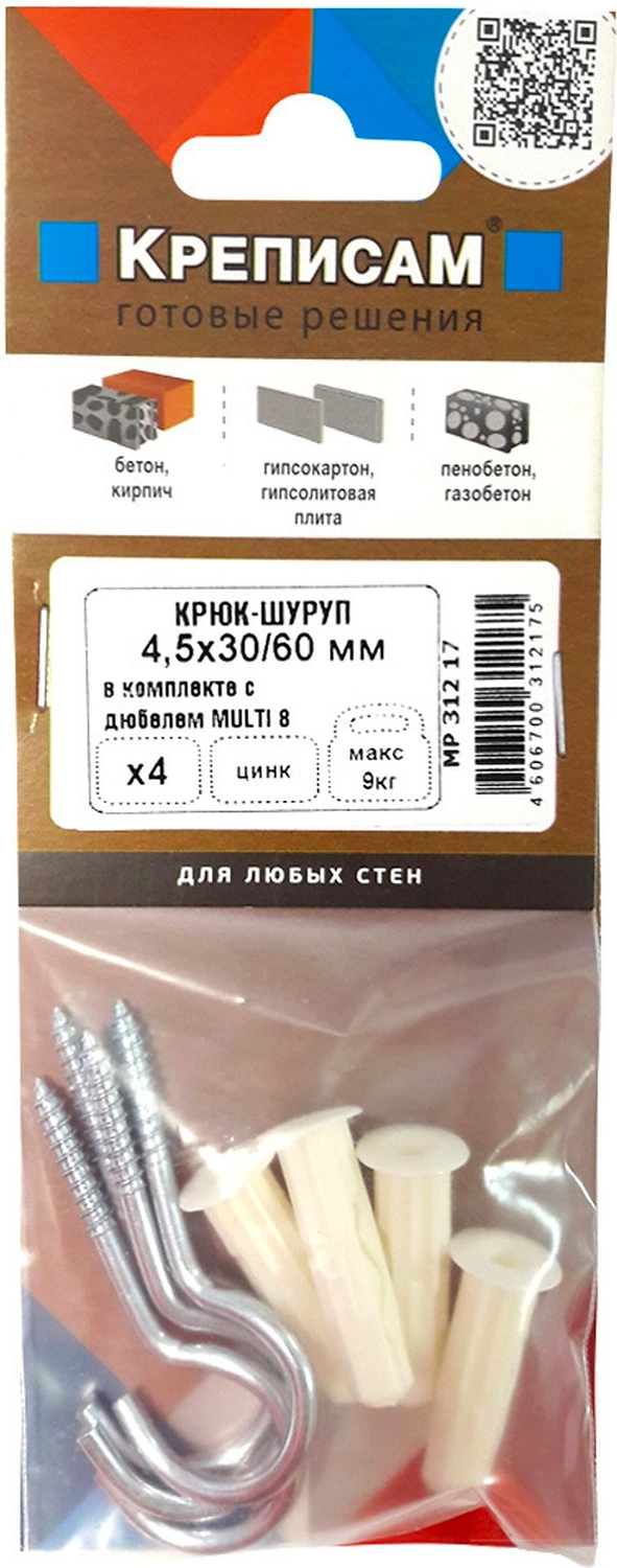 Дюбель ЕВРОПАРТНЕР MULTI Plug 8x32 мм с крюк-шурупом прямоугол. 4,5x30 мм 4 шт