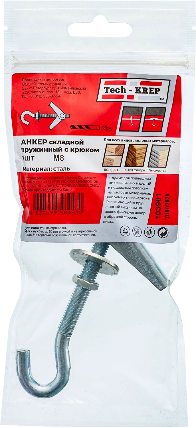 Дюбель складной пружинный с крюком используют для крепления различных светильников, элементов стеллажей, карнизов для штор и навесных шкафов, кабельных лотков и т.п.