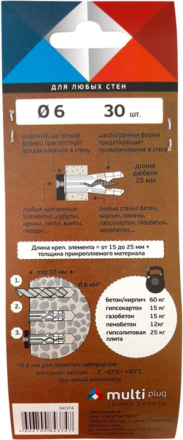Дюбель универсальный распорный ЕВРОПАРТНЕР MULTI Plug 6x25 мм 30 шт