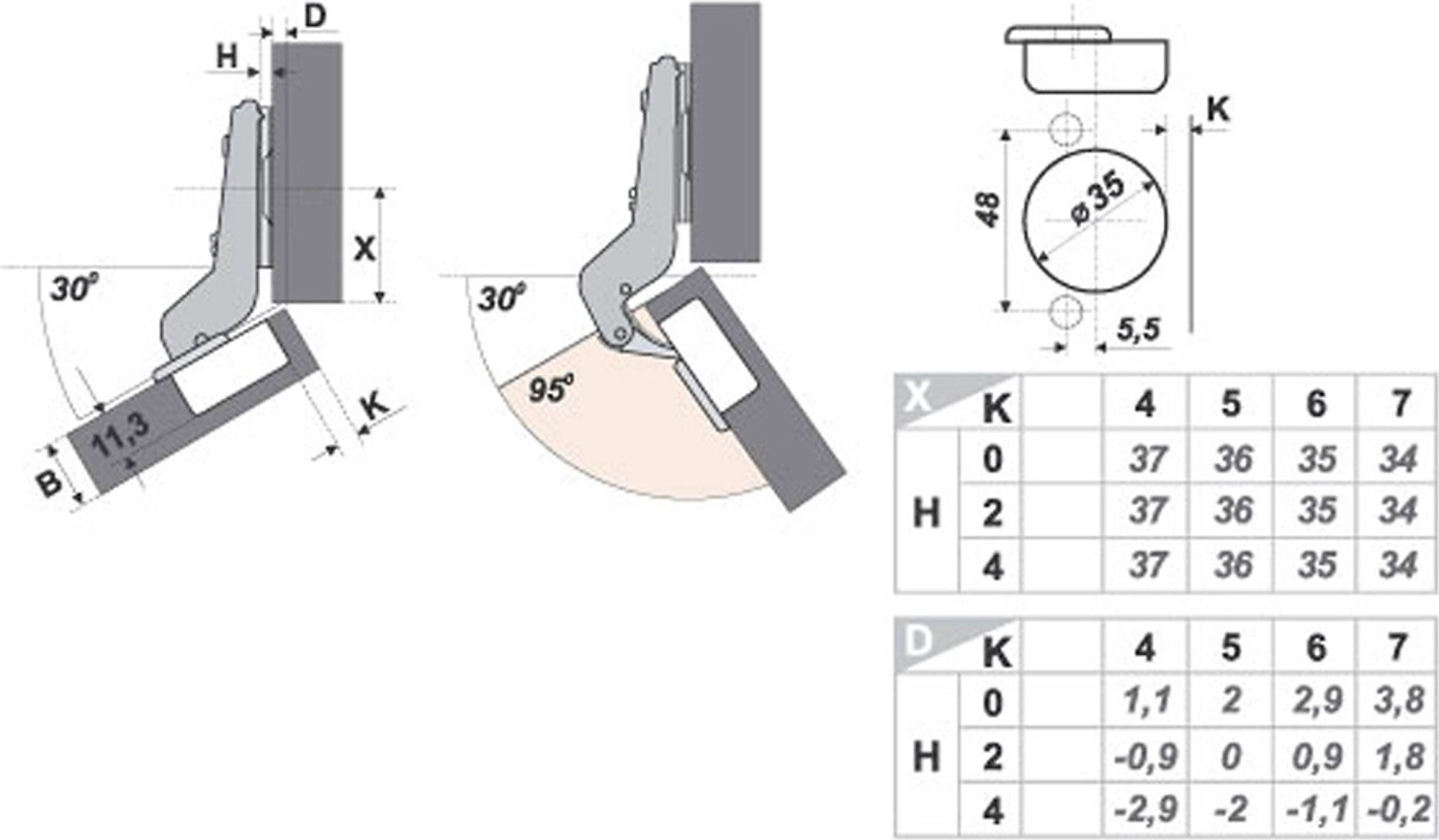 Глубина чашки - 11.3 мм, диаметр чашки 35 мм, межцентровое расстояние 48 мм.