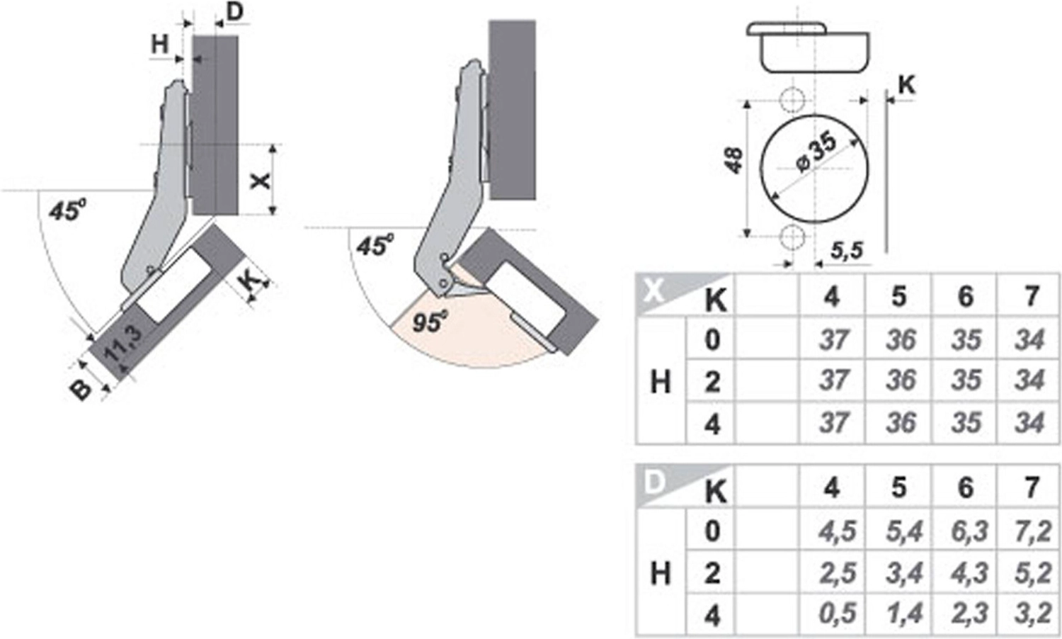 Для вкладной двери, используется для угловых 45о шкафов, угол открывания 95, система соединения с монтажной планкой Slide-on.