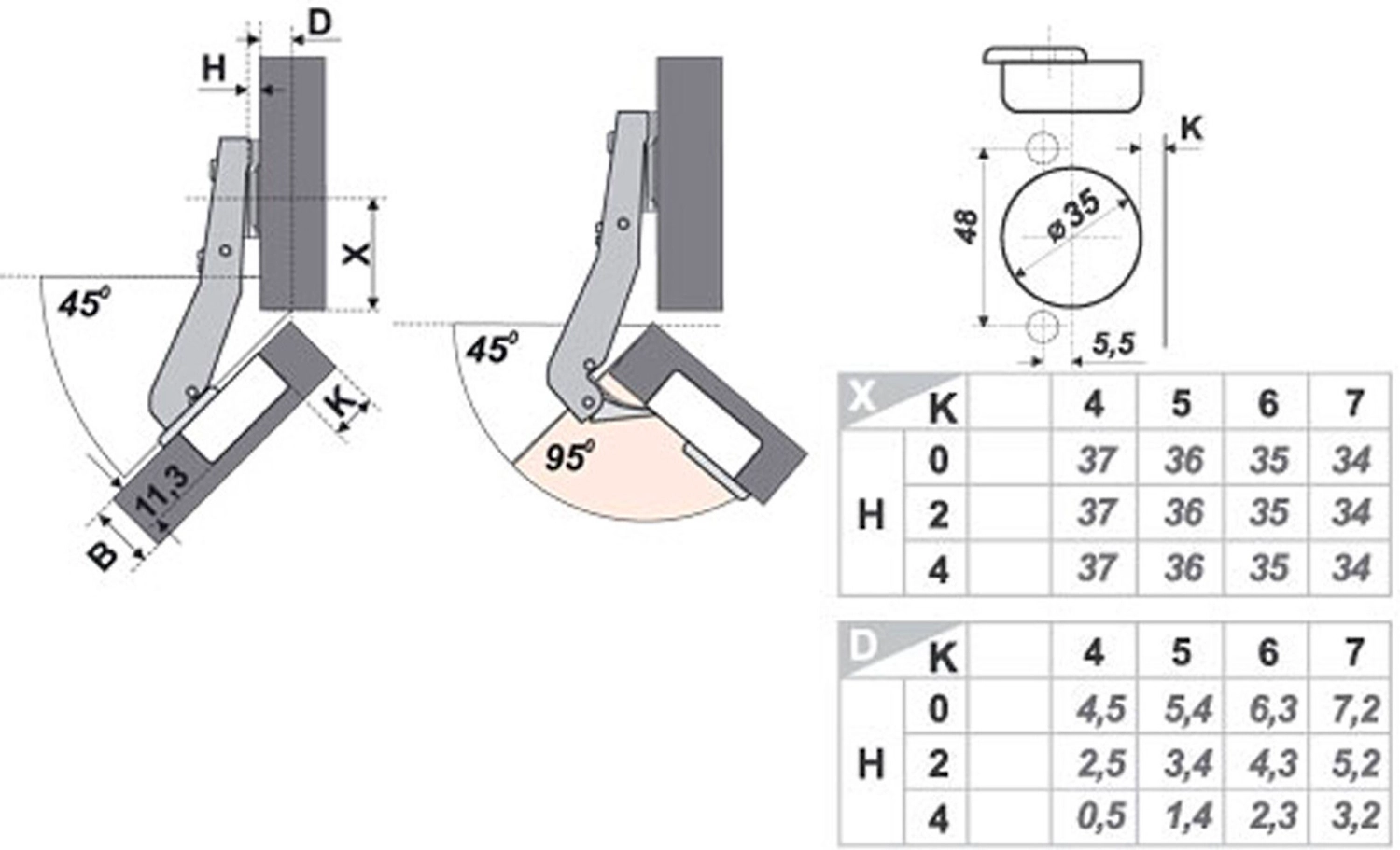 Для вкладной двери, используется для угловых 45о шкафов, угол открывания 95 градусов, имеет встроенный гидравлический амортизатор, система соединения с монтажной планкой Slide-on.