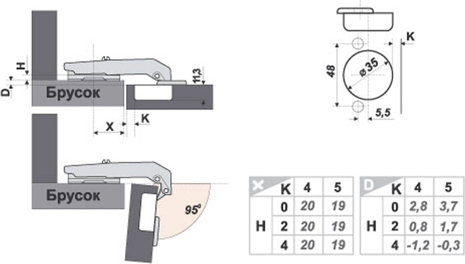 Глубина чашки - 11.3 мм, диаметр чашки 35 мм., межцентровое расстояние 48 мм