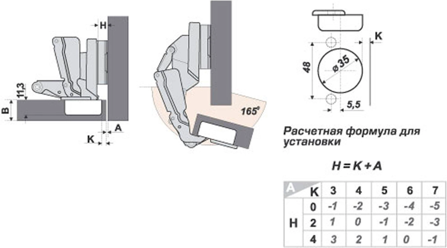 Глубина чашки - 11.3 мм, диаметр чашки 35 мм, межцентровое расстояние 48 мм.