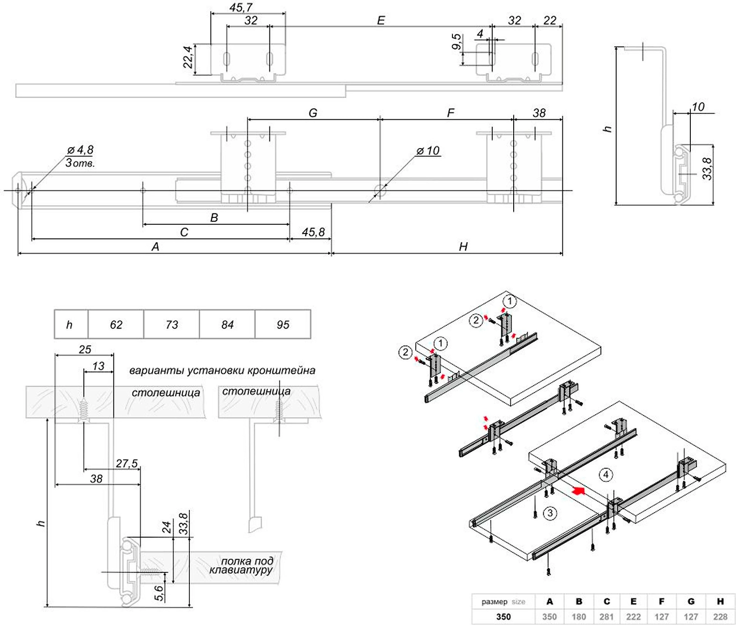 Двухсекционные, неполного выдвижения, монтажная длина 350 мм