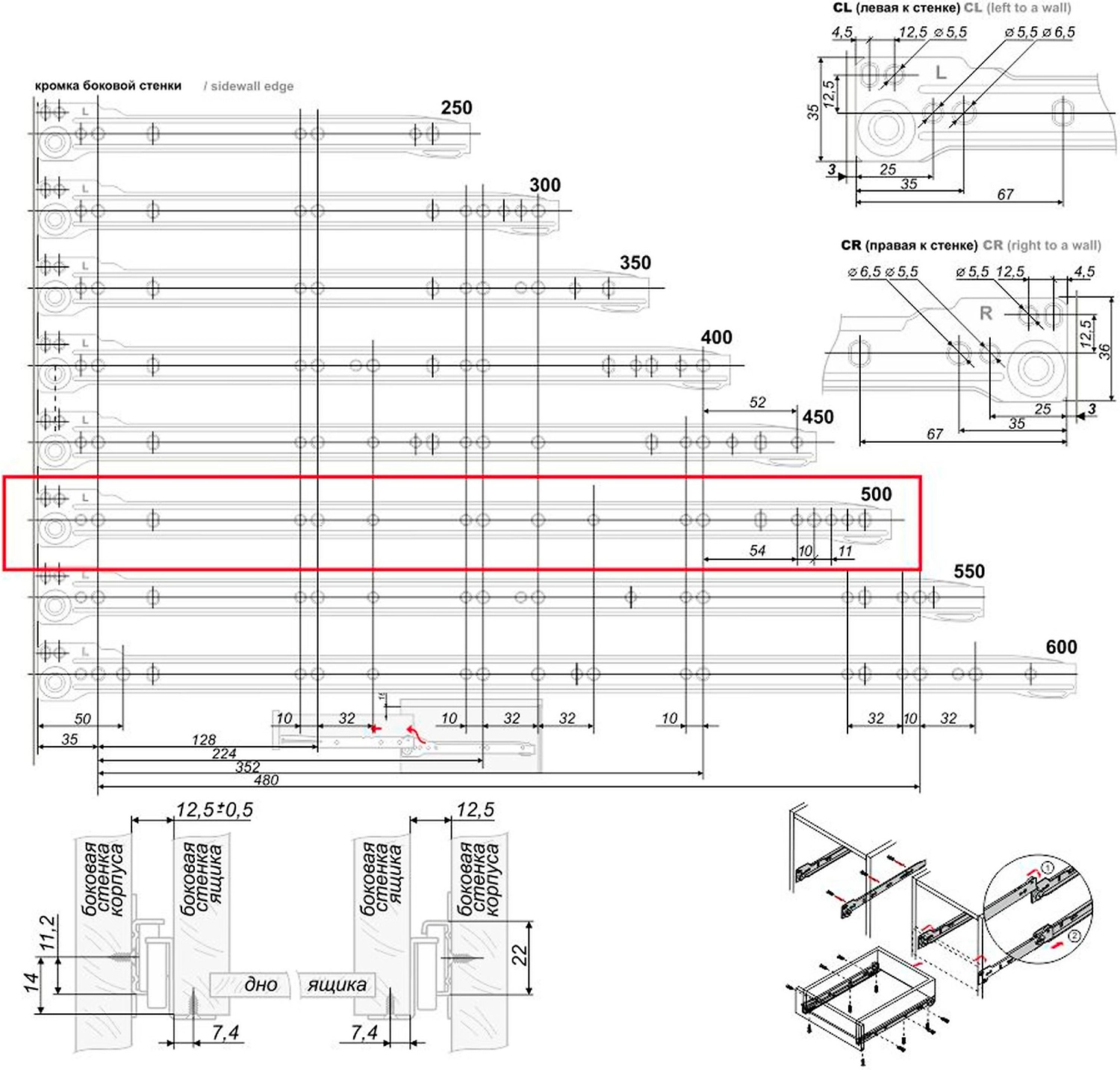 Неполного выдвижения, монтажная длина 500 мм, цвет черный