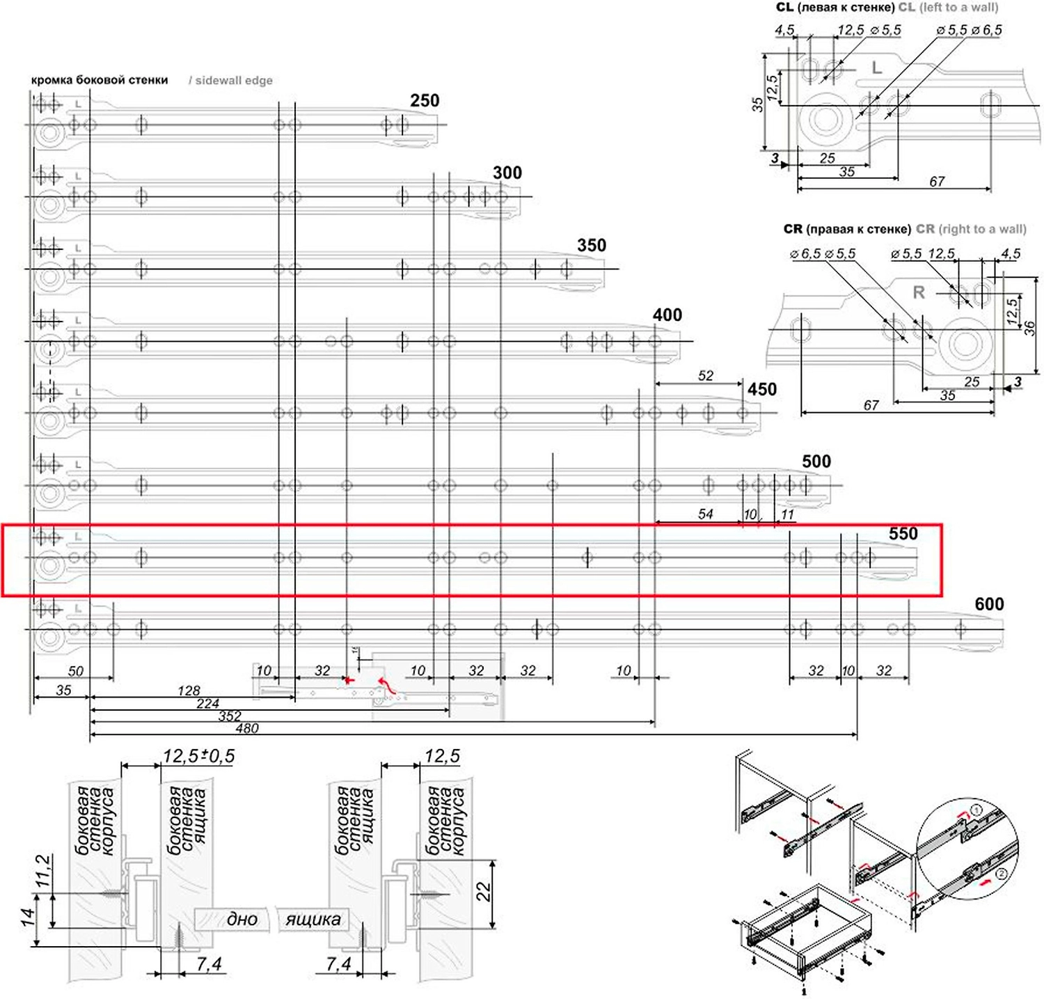 Неполного выдвижения, монтажная длина 550 мм, цвет черный