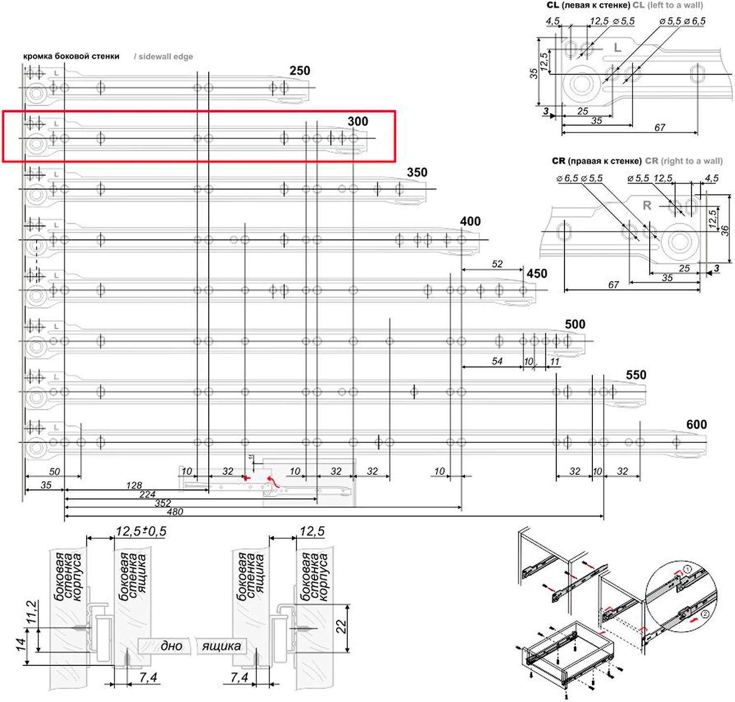 Неполного выдвижения, монтажная длина 300 мм, цвет белый