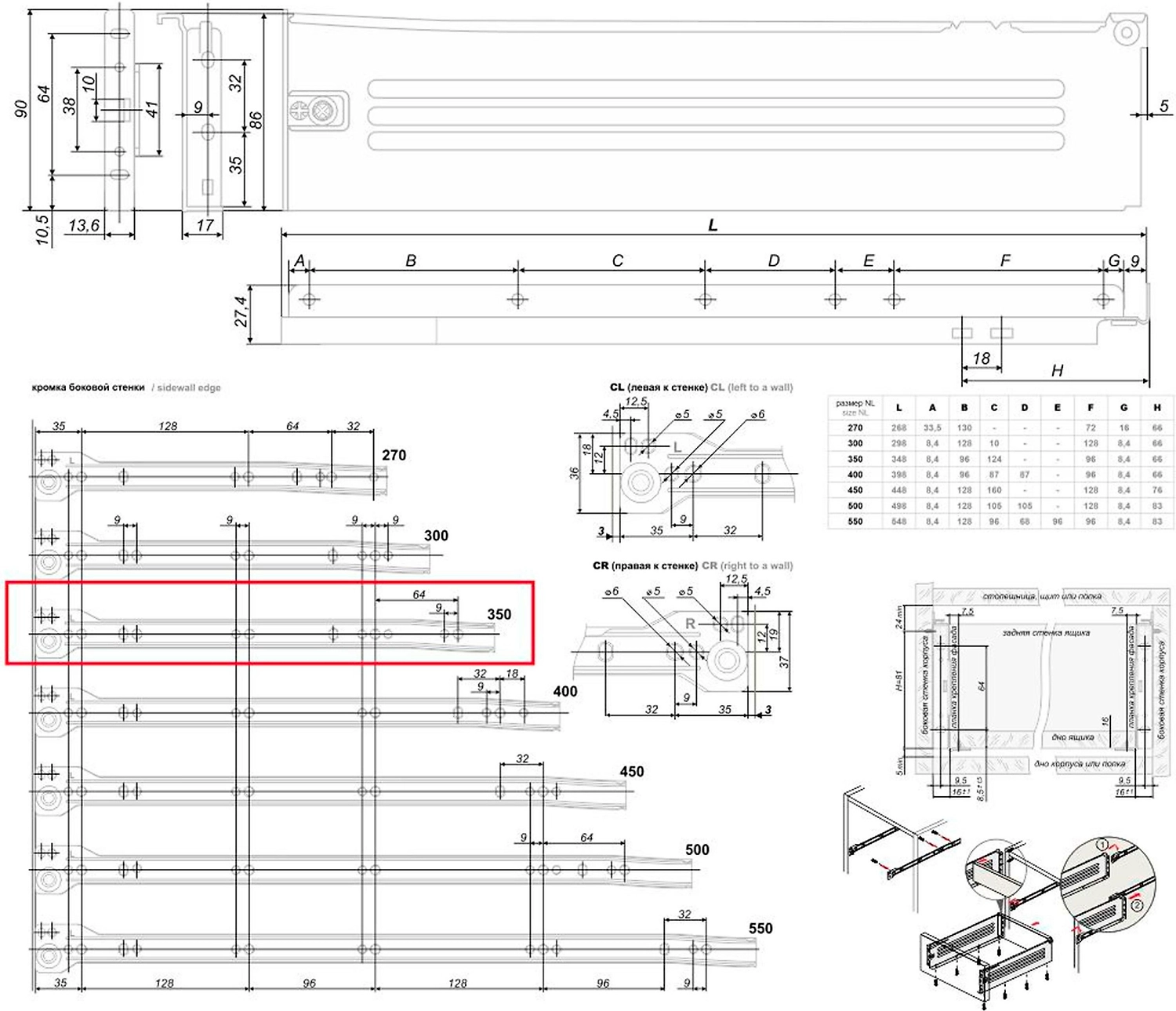 Применяется для изготовления выдвижных ящиков, с регулировкой фасада по высоте (+/- 2 мм). Высота боковой стенки 86 мм