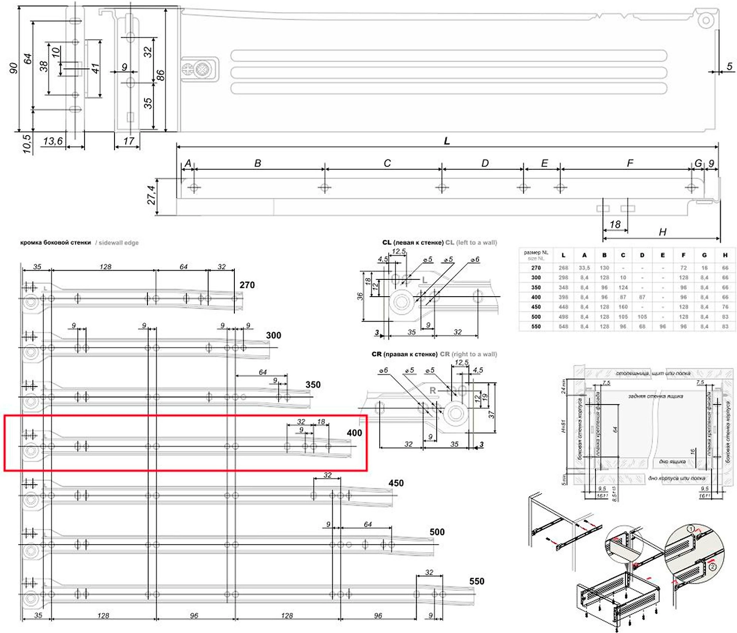 Применяется для изготовления выдвижных ящиков, с регулировкой фасада по высоте (+/- 2 мм). Высота боковой стенки 86 мм