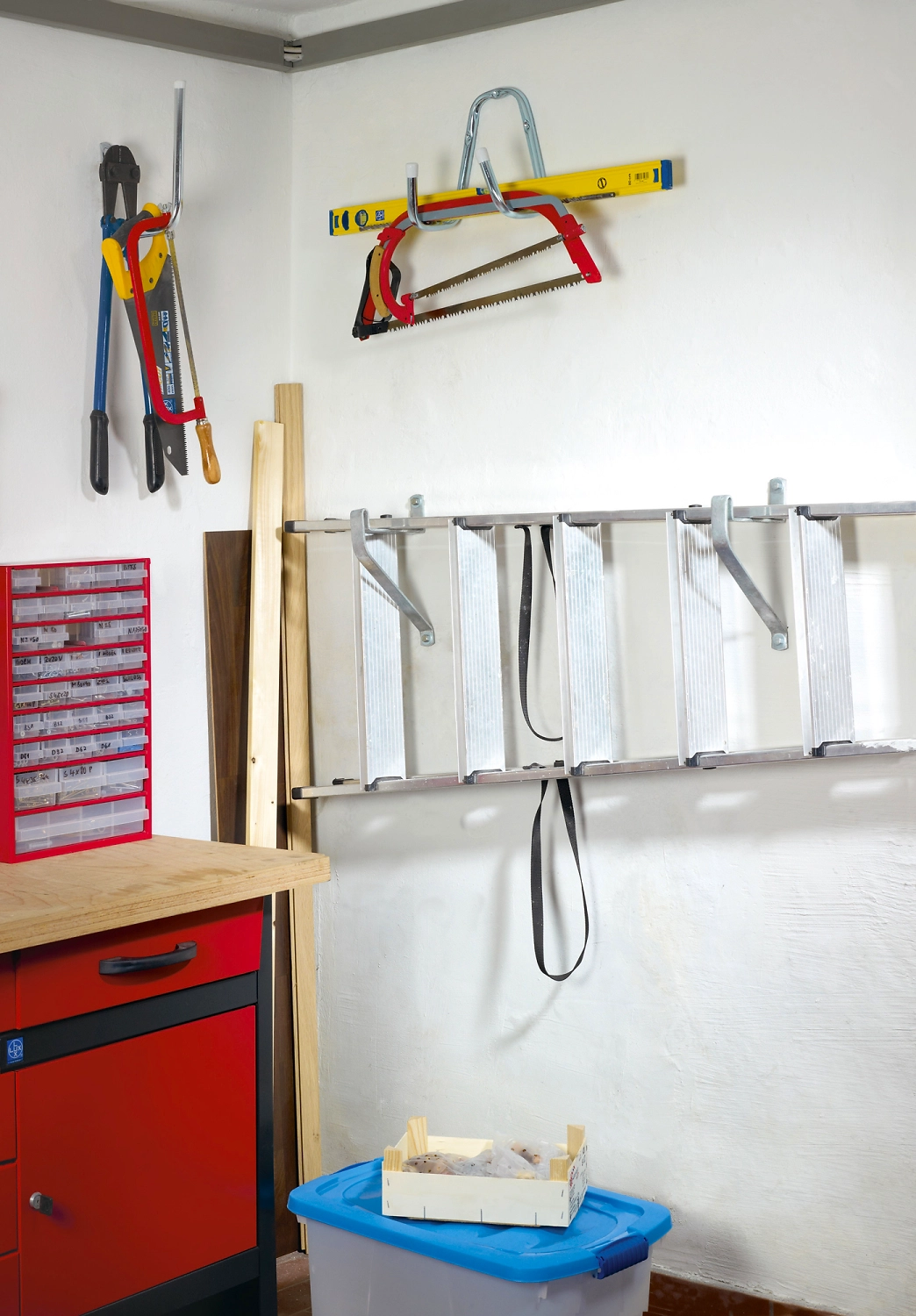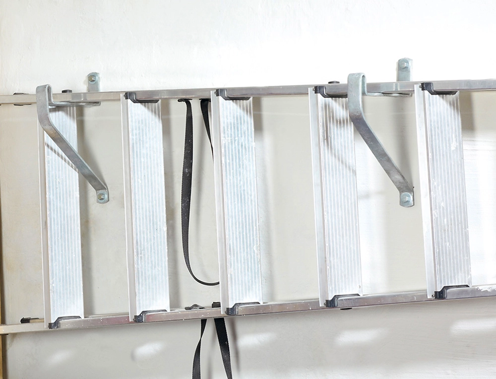Крюк из листовой оцинкованной стали подходит для крепления лестниц к стене. Конструкция имеет размеры 275x210 мм и грузоподъемность 50 кг.