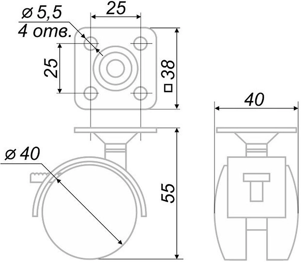 Поворотная колесная опора с тормозом, с площадкой для крепления к мебели 38х38мм. Материал: колесо - нейлон, ось - сталь