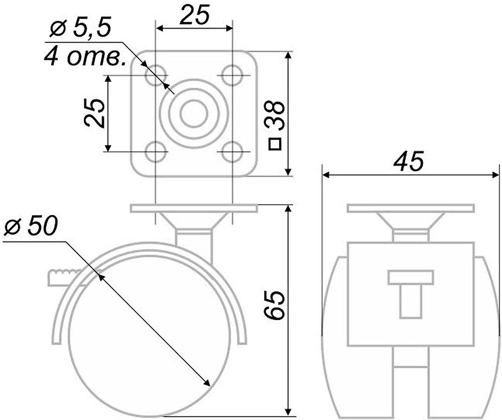 Поворотная колесная опора с тормозом, с площадкой для крепления к мебели 38х38мм. Материал: колесо - нейлон, ось - сталь
