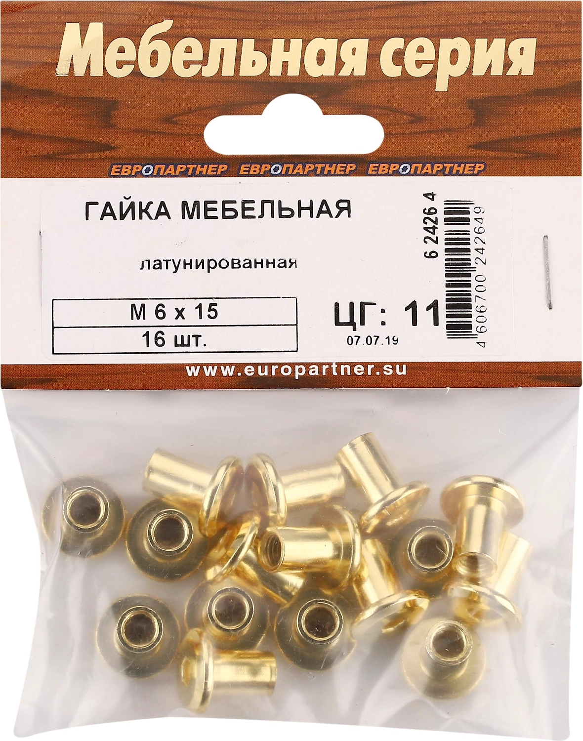 Гайка мебельная латунированная М 6 х 15 мм 16 шт
