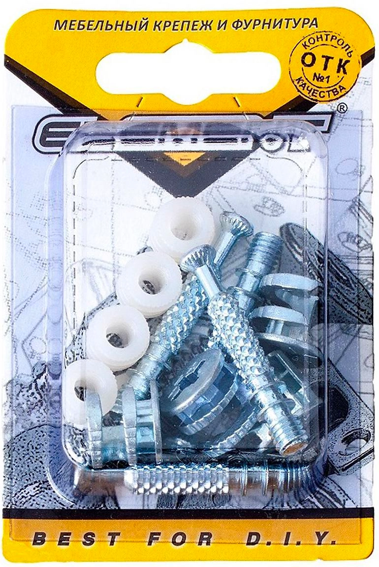 В комплект входит: втулка-саморез для эксцентриковой стяжки 7х45 (4шт.), эксцентриковая стяжка для ДСП 18-20мм (4 шт.), дюбель мебельный пластмассовый М6 (4 шт).