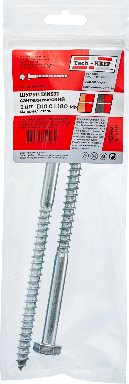 Шуруп сантехнический Tech-KREP M10х180 мм 2 шт