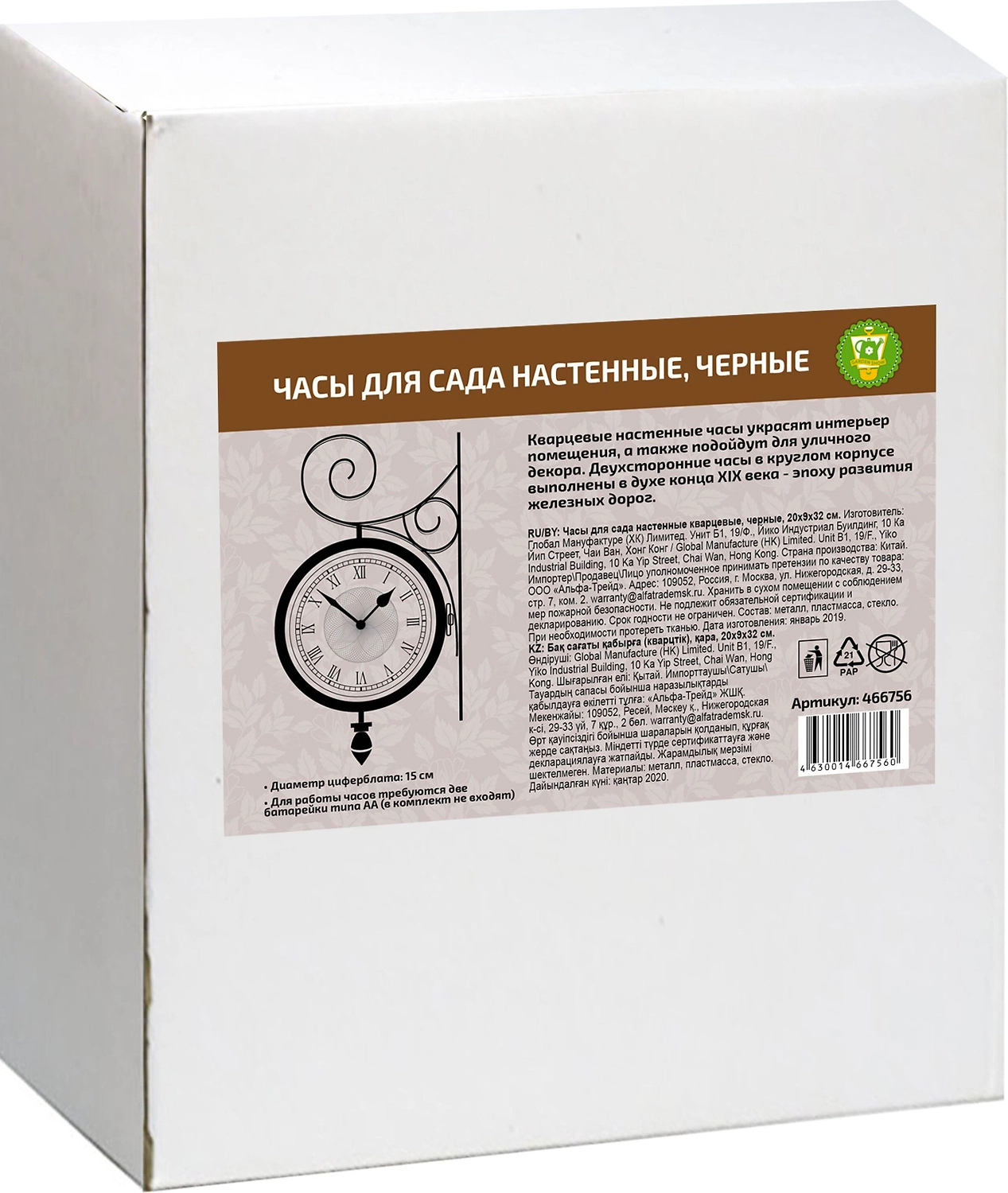 Кварцевые часы для сада станут замечательным дизайнерским решением для декора сада, дачи или гостиной дома. Часы оформлены римскими цифрами и имеют две стрелки - часовую и минутную. Циферблат бежевого цвета с крупными цифрами. Часы крепятся к стене с помощью кронштейна. Для работы часов требуются две батарейки типа АА (в комплект не входят).