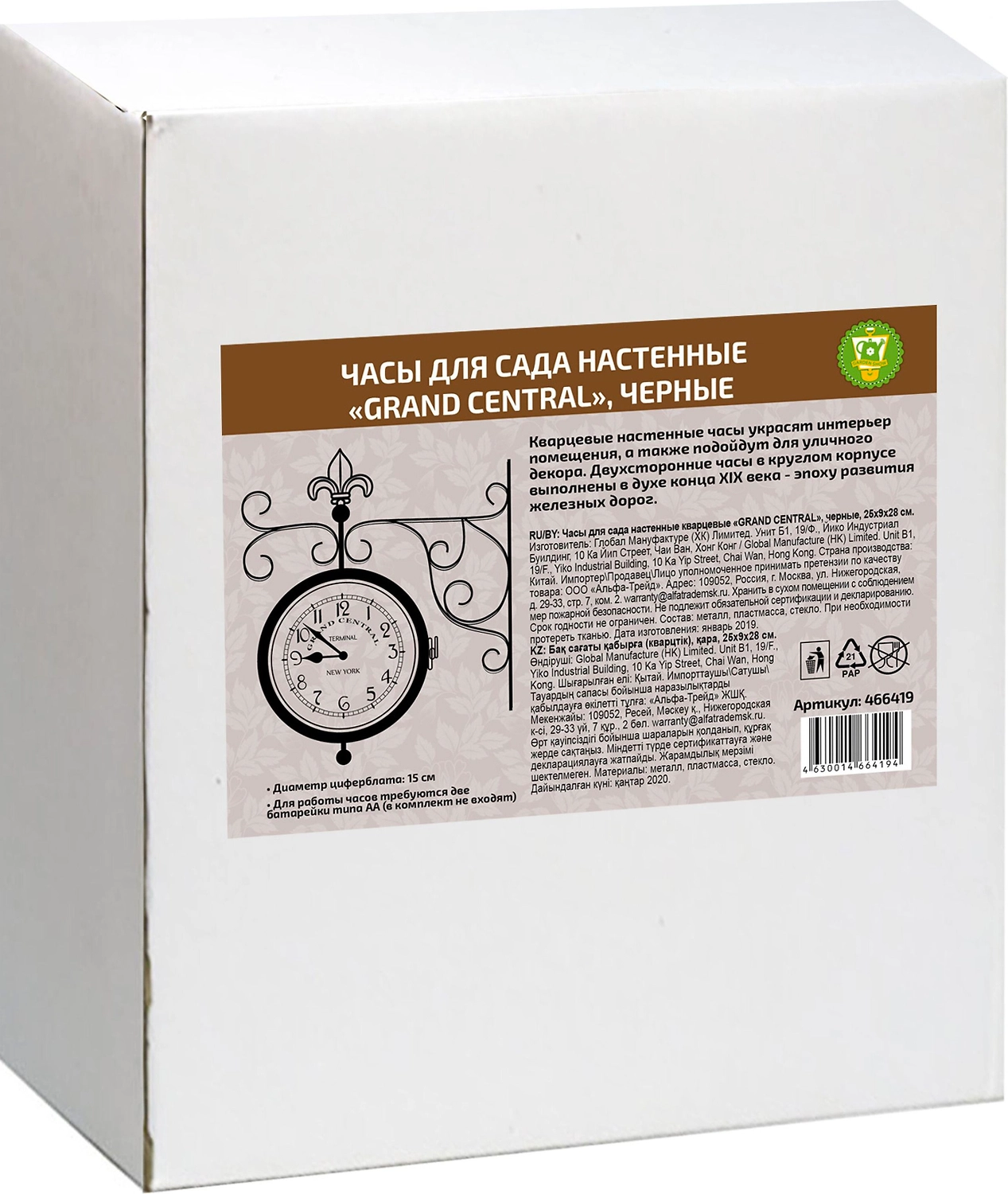 Кварцевые часы для сада станут замечательным дизайнерским решением для декора сада, дачи или гостиной дома. Часы оформлены арабскими цифрами и имеют две стрелки - часовую и минутную. Циферблат оформлен надписью: Grand Central Terminal. New York. Часы крепятся к стене с помощью кронштейна. Для работы часов требуются две батарейки типа АА (в комплект не входят).