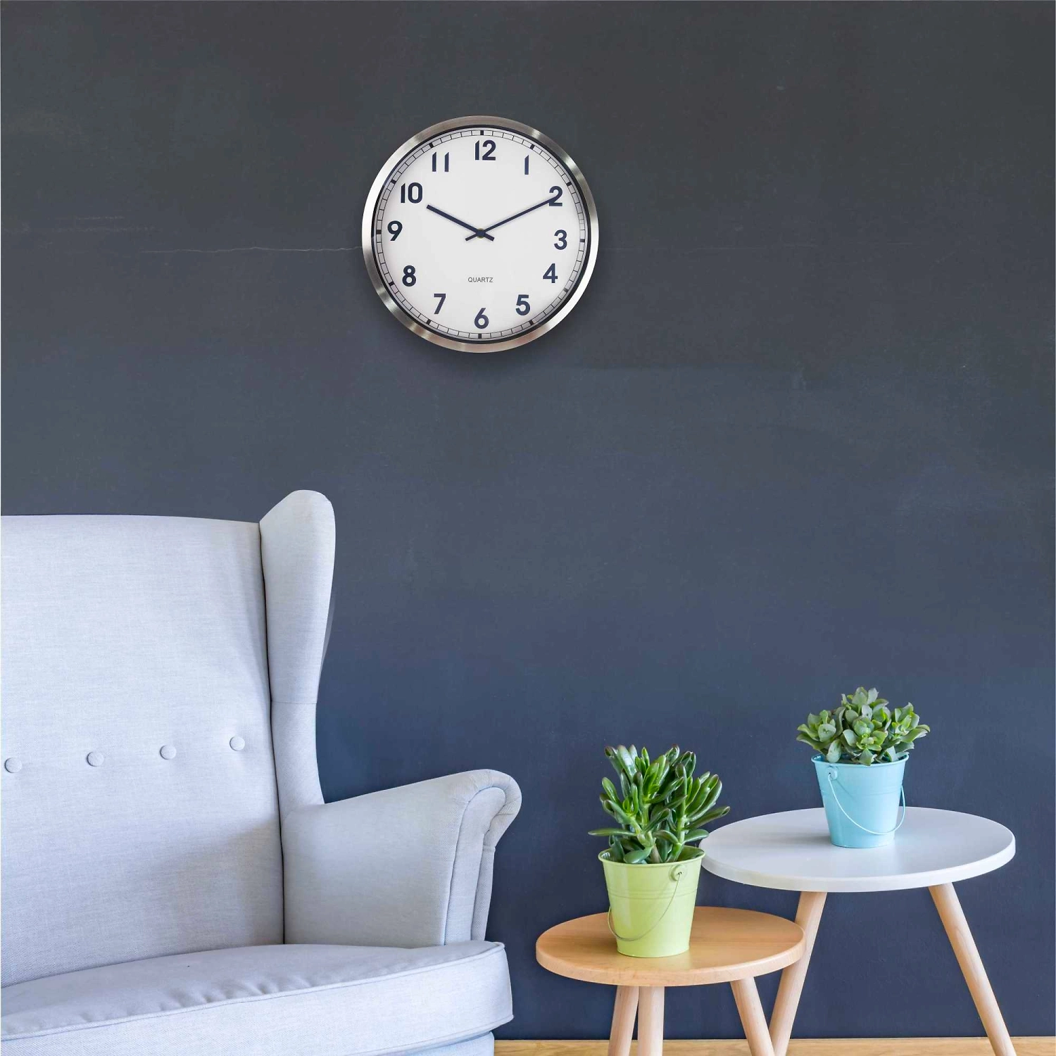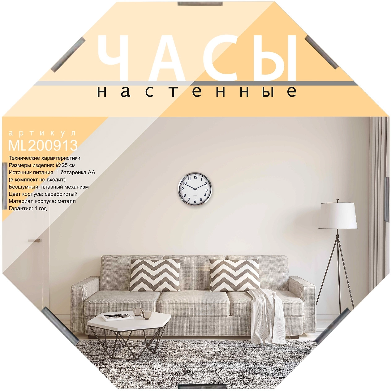 Настенные часы с артикулом ML200913 изготовлены в форме круга, который является символом бесконечности и совершенства. Данная модель представляет собой часы с корпусом из металла в стиле Hi-Tech. Отлично дополнят помещение с современным дизайном. Лицевая сторона часов защищена минеральным стеклом. На циферблате белого цвета расположены арабские цифры и три стрелки. Часы сохранят тишину в помещении благодаря использованию бесшумного механизма плавного хода, который работает от батарейки стандарта АА (не входит в комплект).