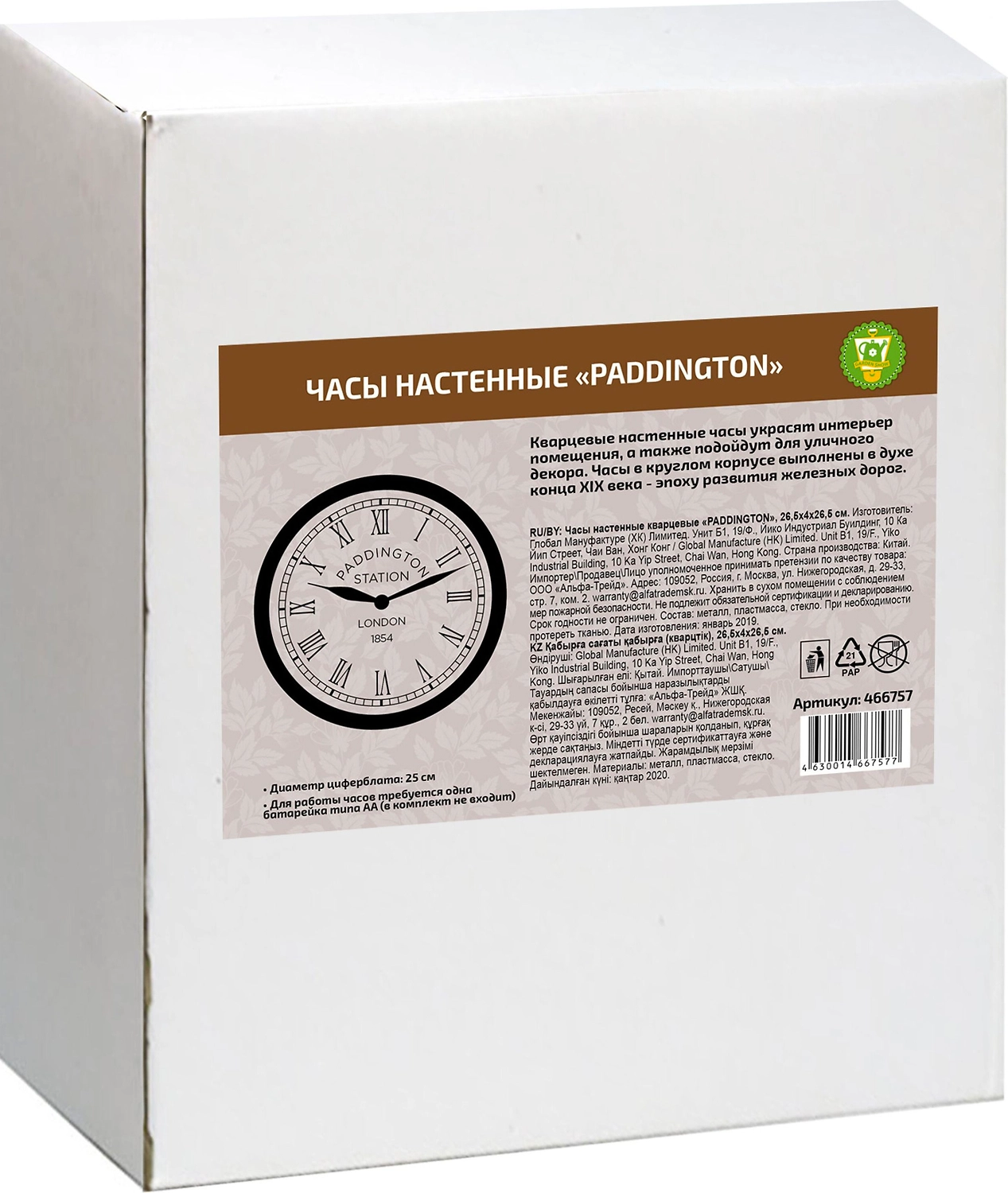 Кварцевые настенные часы станут замечательным дизайнерским решением как для дома, так и для офиса. Часы оформлены римскими цифрами и имеют две стрелки - часовую и минутную. Циферблат оформлен надписью: Paddington Station. London 1854. Часы крепятся к стене с помощью подвеса. Для работы часов требуется одна батарейка типа АА (в комплект не входит).