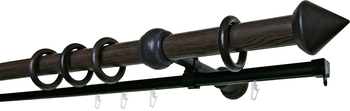 Классический двухрядный карниз настенного крепления. Штанга и фурнитура выполнены из дерева, второй ряд - металлическая направляющая.