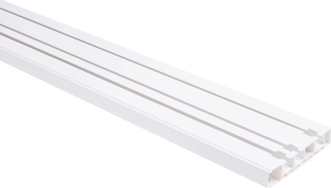Пластиковые трехрядные карнизы для штор – незаменимые потолочные карнизы. Прикрепленный к потолку, такой 3-х рядный карниз-невидимка выдерживает даже тяжелые многослойные шторы.
