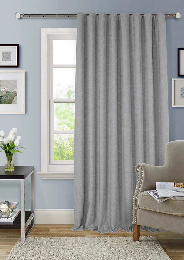 Интерьерная штора легко крепится на карниз с помощью шторной ленты, при этом размер и количество складок вы можете менять на свой вкус, ткань легко драпируется и выглядит очень изящно.