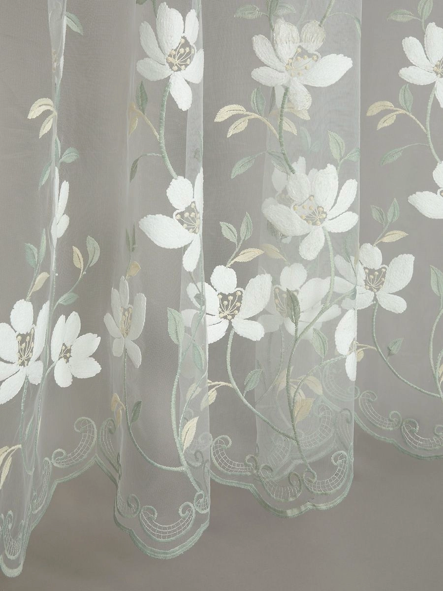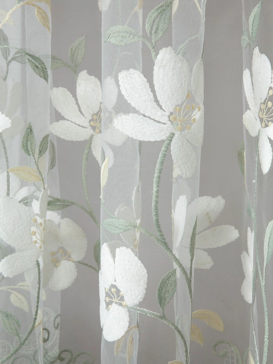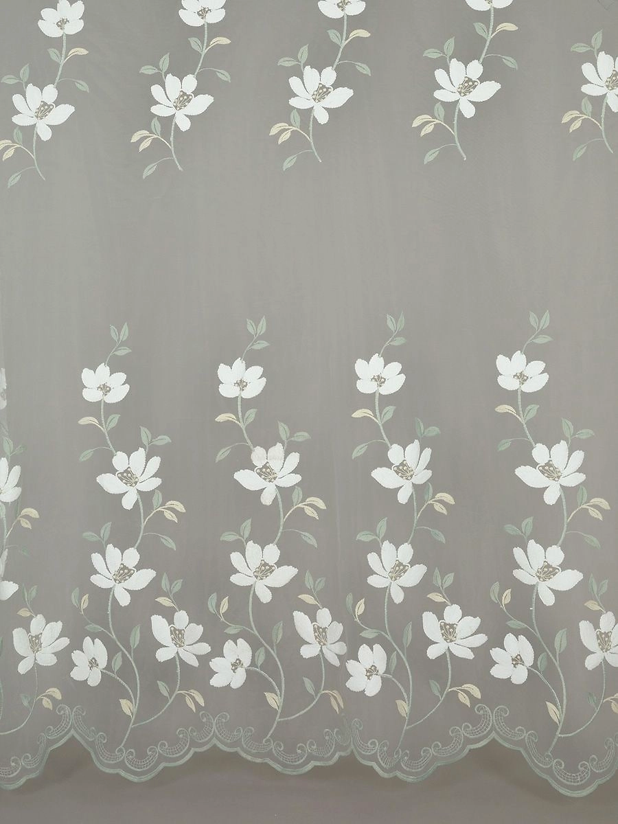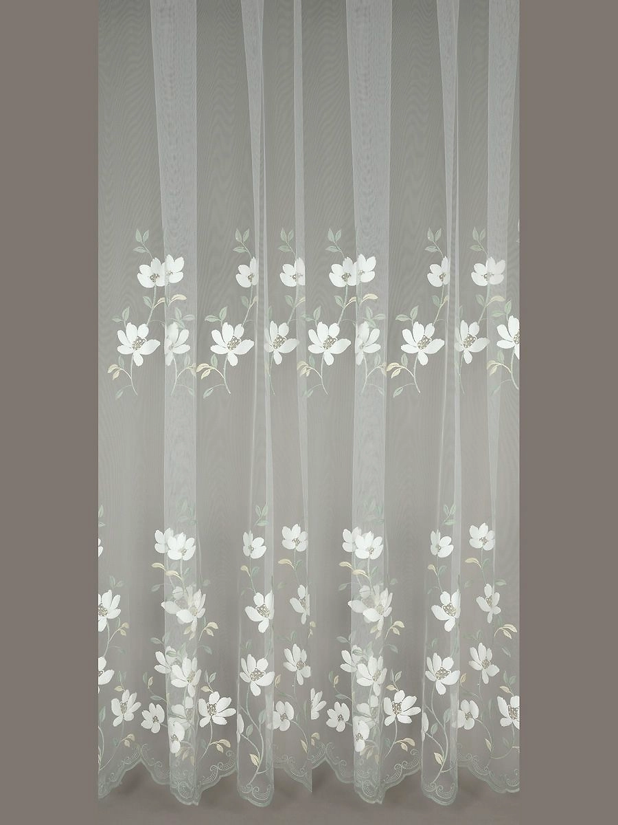 Штора тюлевая из мелкой сетки с вышивкой с виде больших белых цветов размер 300x270 см будет прекрасно смотреться в комплекте с плотными шторами. Крепление шторная лента.